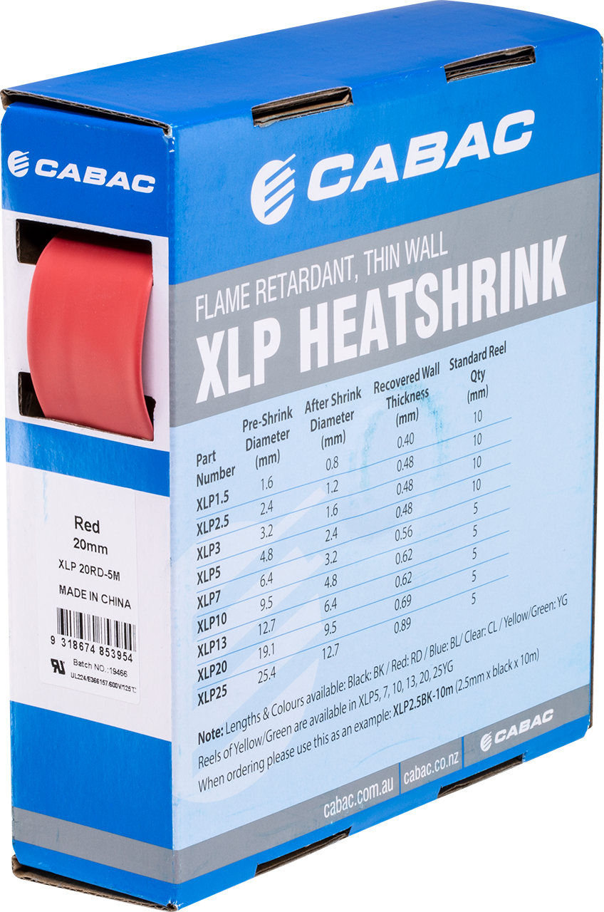 Pre-shrink diameter: 19.1mm After-shrink diameter: 9.5mm Recovered wall thickness: 0.68mm Length: 5m box XLP tubing is available in a wide range of colours and sizes from 1.5mm to 125mm. The product datasheet includes a selection chart for your reference, see Resources.