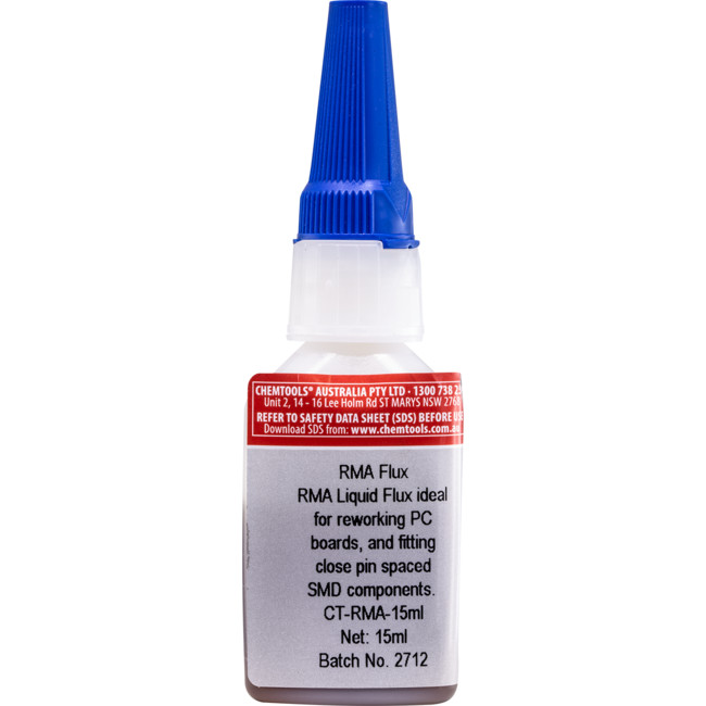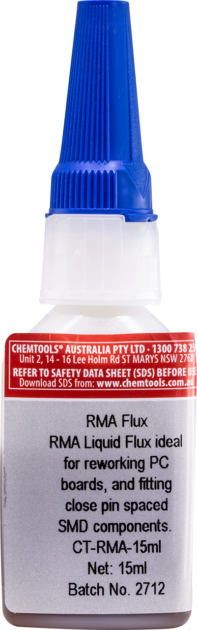 A stable RMA liquid flux supplied in a convenient 15ml bottle . The flux is an ambercolour liquid and ideal for use with multi-layer, surface mount, densely populated and complex boards.