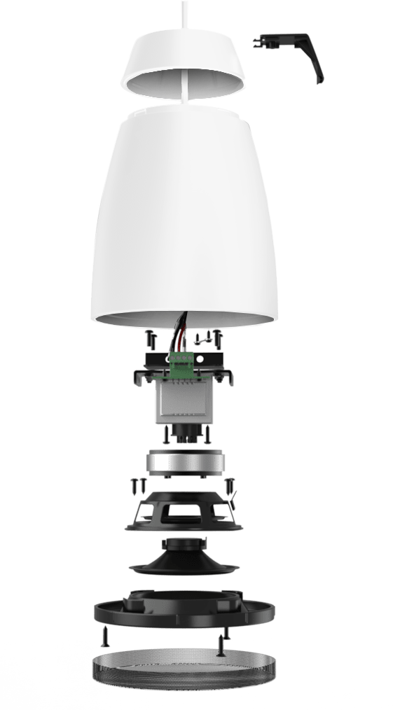 An innovatively designed rear cover of the speaker can beplaced after installation and hides the connection and suspension on the speaker end.