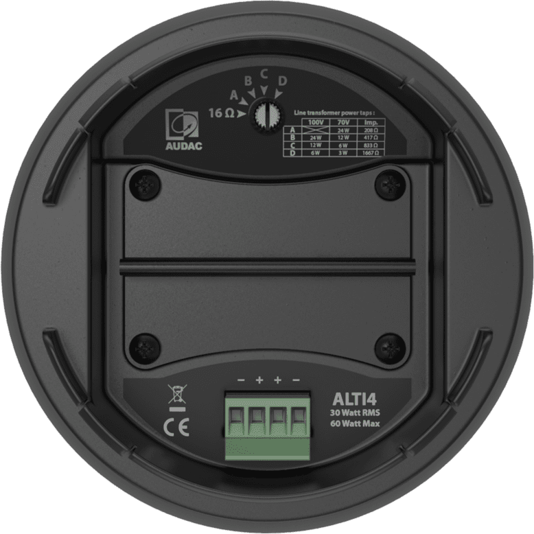 Connections are made through a terminal block connector behind the rear cover, accompanied with a power tap selectorswitch for the tapping of a 70V/100V line transformer with tappings for 24W, 12W, 6W and a 16 Ohm bypass connection.