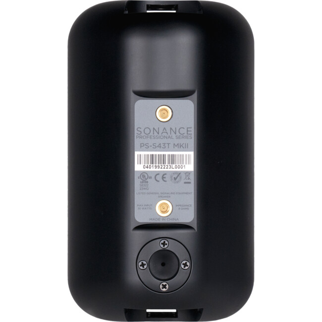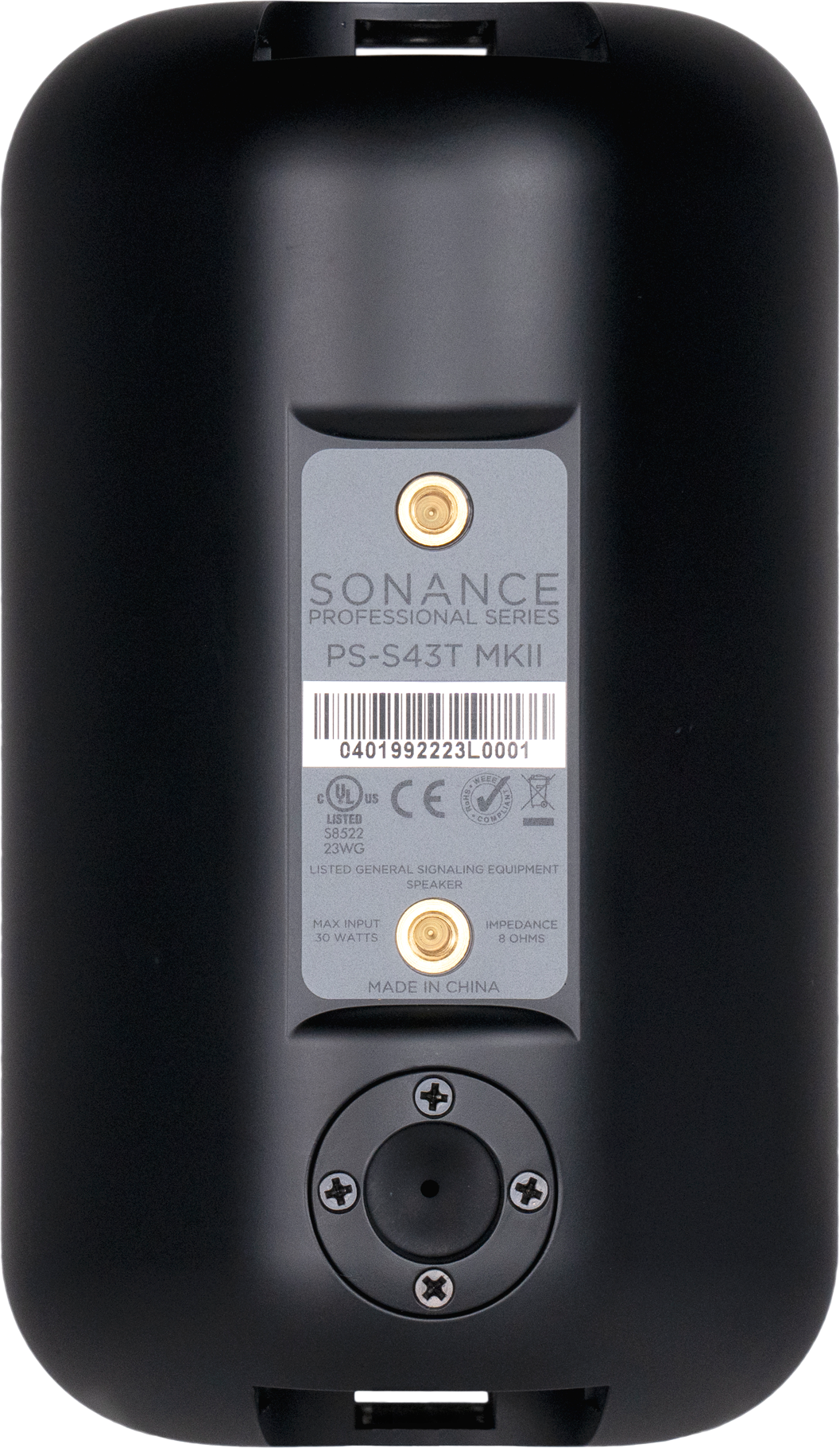 The Sonance PS-S43T MK2 two-way surface-mount loudspeaker features a high-excursion 4.5" woofer, and 1" tweeter for clean, accurate sound. The weatherized IP45-rated enclosure includes Sonance’s Fast-Mount® bracket and front cable connection to speed up the installation process and provide a minimalistic appearance. UL1480 and UL2239 certifications ensure durability and safety.