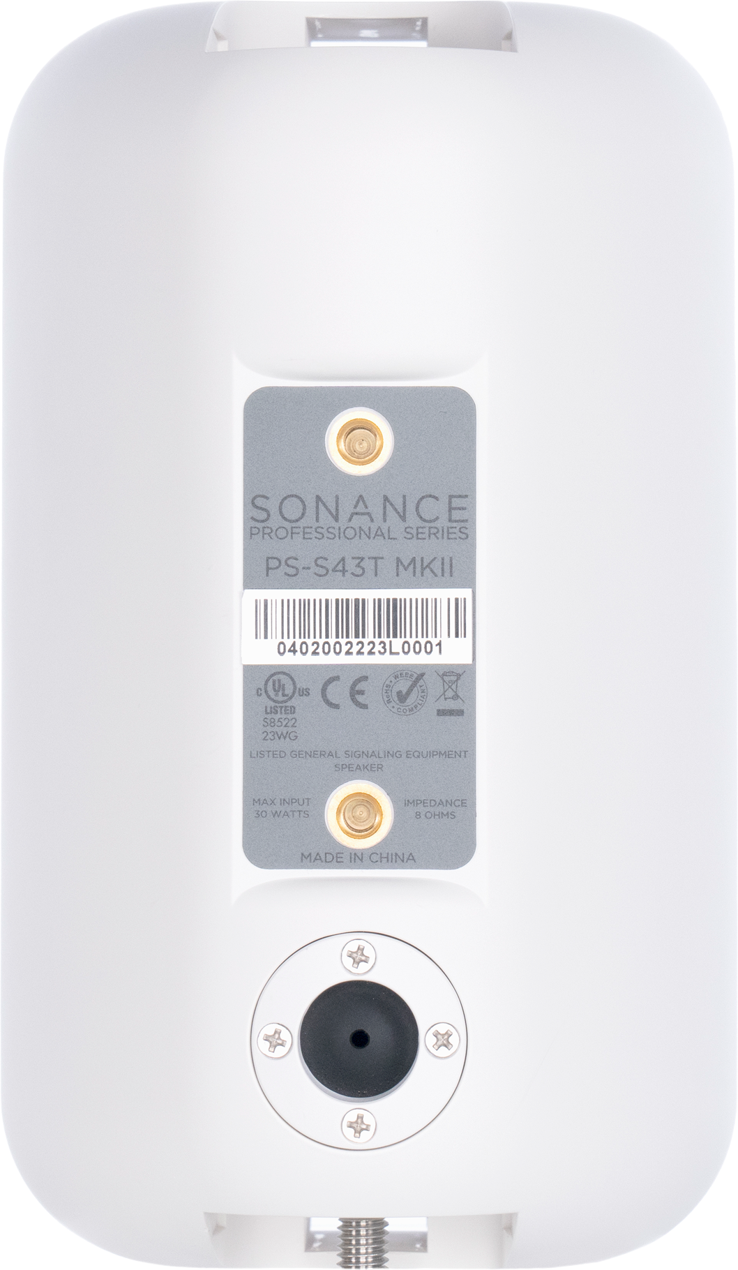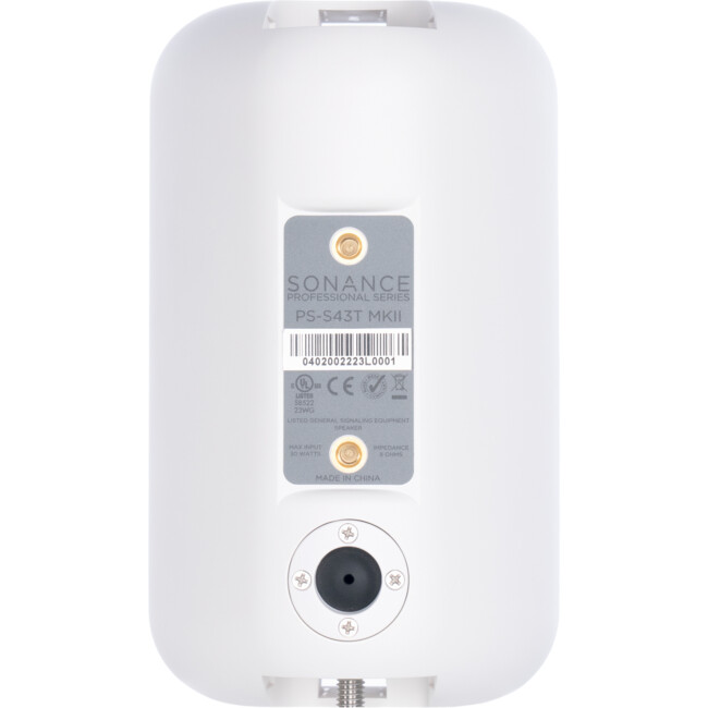 The Sonance PS-S43T MK2 two-way surface-mount loudspeaker features a high-excursion 4.5" woofer, and 1" tweeter for clean, accurate sound. The weatherized IP45-rated enclosure includes Sonance’s Fast-Mount® bracket and front cable connection to speed up the installation process and provide a minimalistic appearance. UL1480 and UL2239 certifications ensure durability and safety.