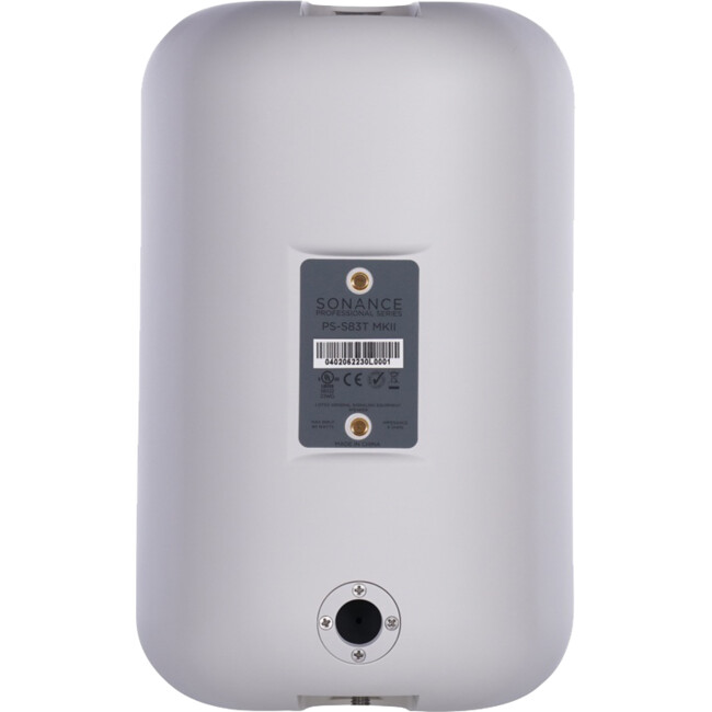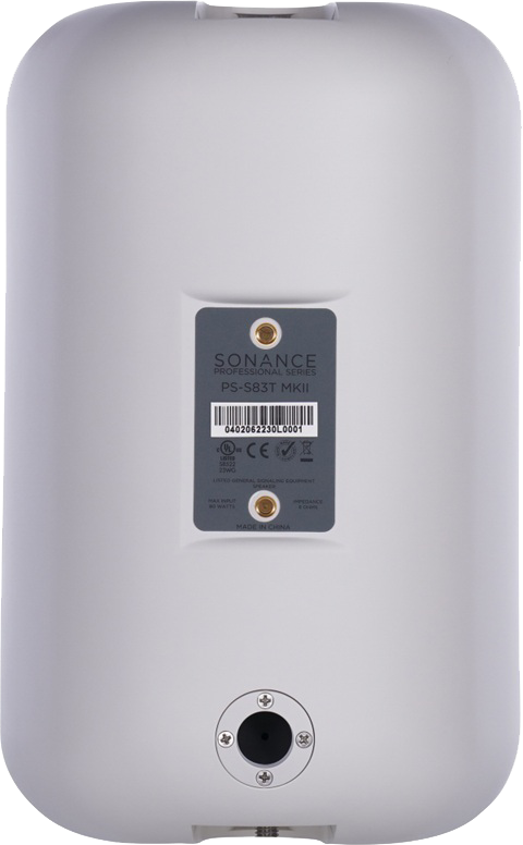The Sonance PS-S83T MKII two-way surface-mount loudspeaker features a high-excursion 8" woofer, and 1" tweeter for clean, accurate sound. The weatherized IP45-rated enclosure includes Sonance’s Fast-Mount® bracket and front cable connection to speed up the installation process and provide a minimalistic appearance. UL1480 and UL2239 certifications ensure durability and safety.