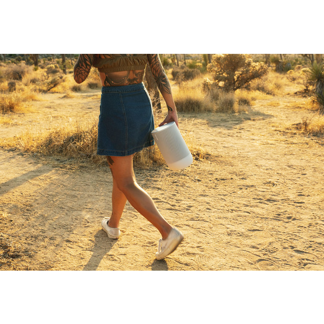 The built-in handle and cordless design make it easy to bring Move from room to room, out to your patio, to the beach and beyond.