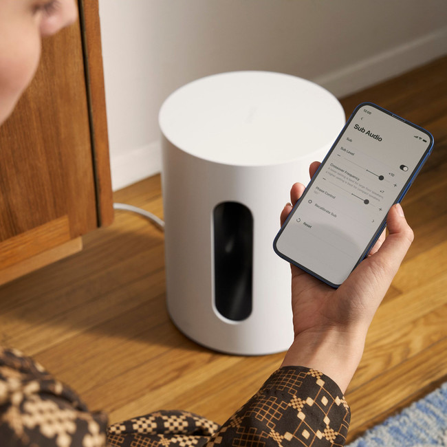Audio settings automatically equalise to balance Sub Mini and the paired Sonos product(s). Use the Sonos app to adjust bass, treble, and loudness.