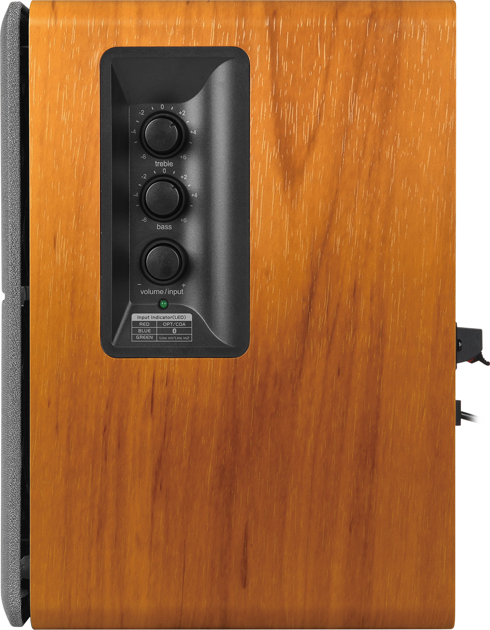 On-Board Controls Adjust the EQ through the use of the on-board controls located on the active/powered speaker. Treble, bass, and volume knobs located on the side panel.