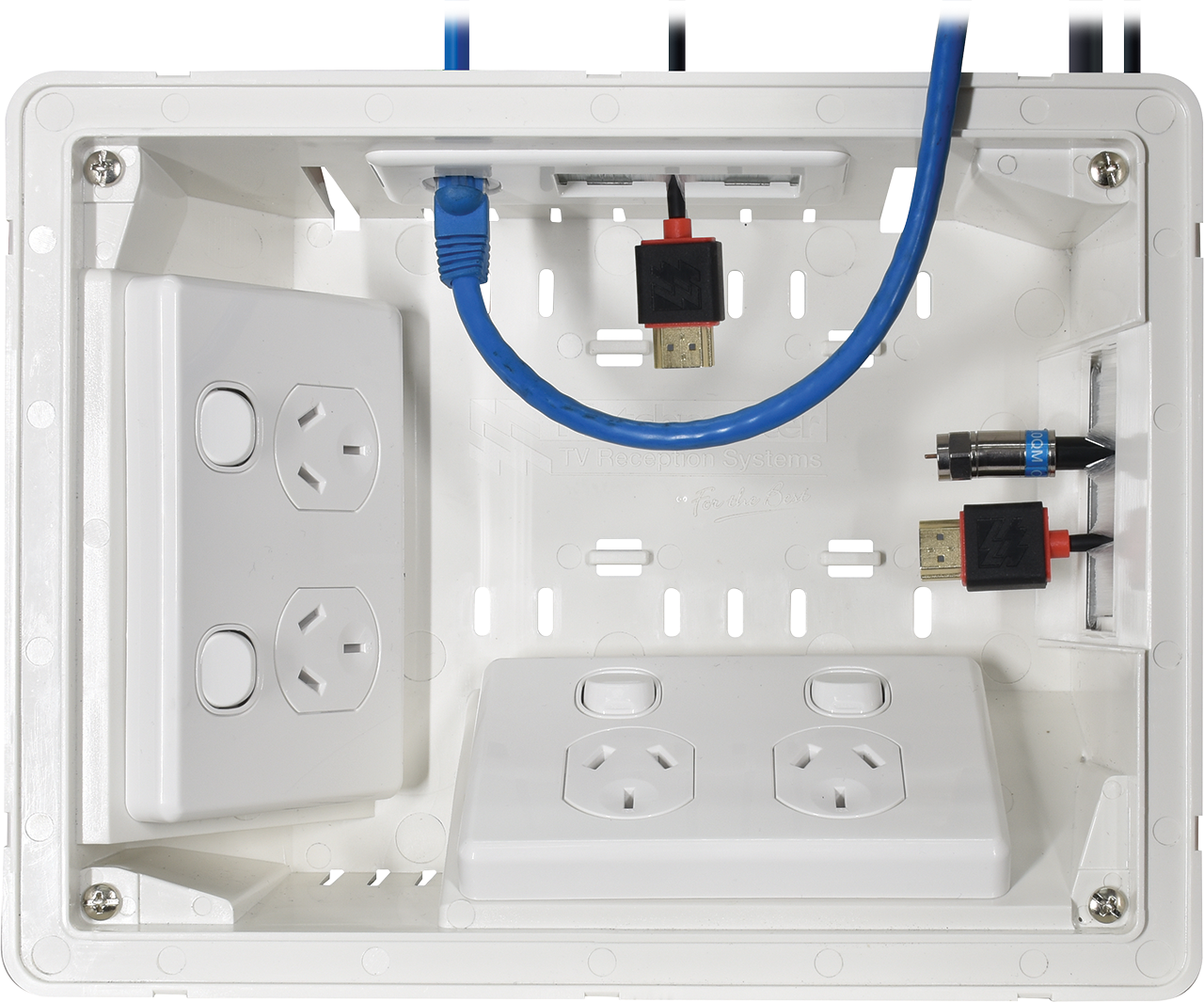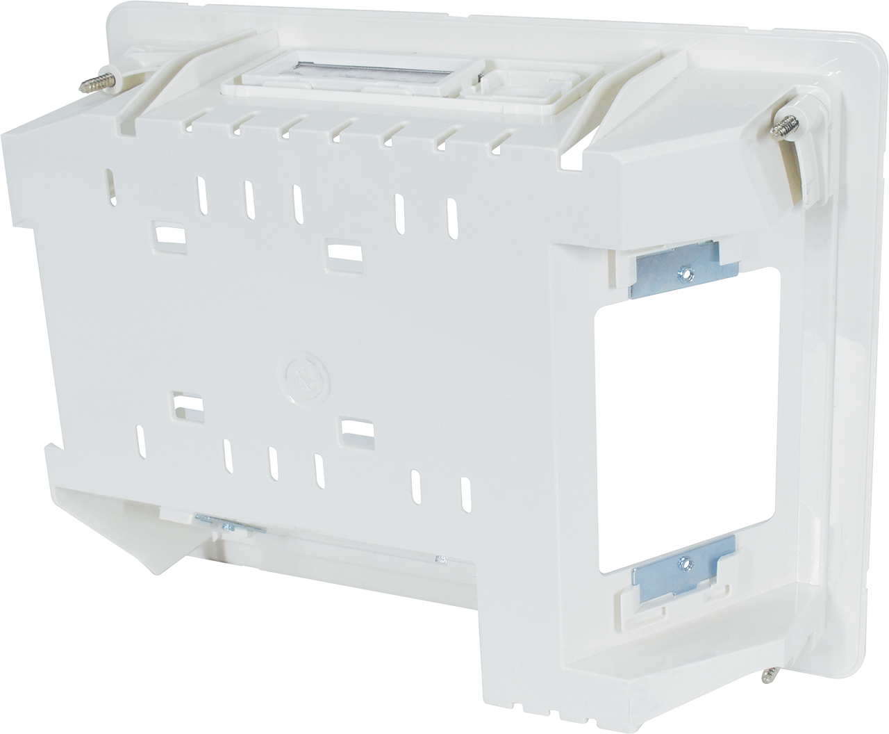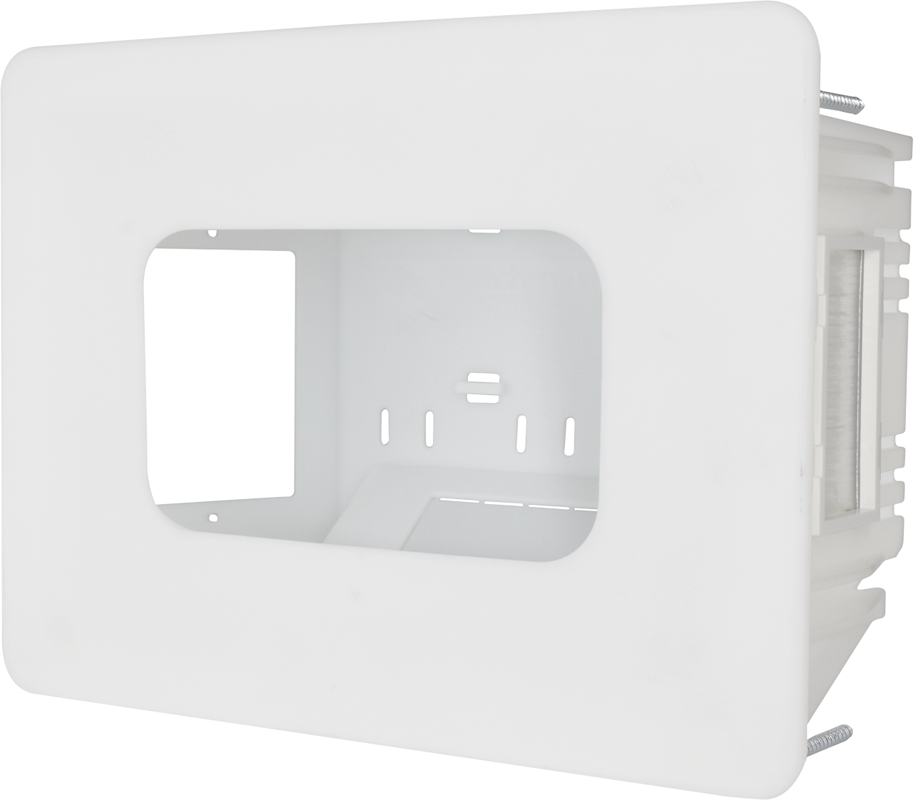 The 04MM-RP04 is a medium-sized recessed wall box for use with AV, data and power outlets. RP04 features two wall plate installation locations and two integrated brush plates, one with a Clipsal® fitting mech point for cable management and fit-off. Matchmaster’s recessed wall box is simple to use with its cut-out template and smart folding wall clips to lock the unit in place quickly. The RP04 is perfect for housing outlet plates such as power, TV, A/V, data points and all general-purpose outlets. In addition, it is ideal for use behind kitchen appliances, A/V cabinets, flat-screen TVs, bedroom furniture, and any appliance or furniture placed flush against the wall.