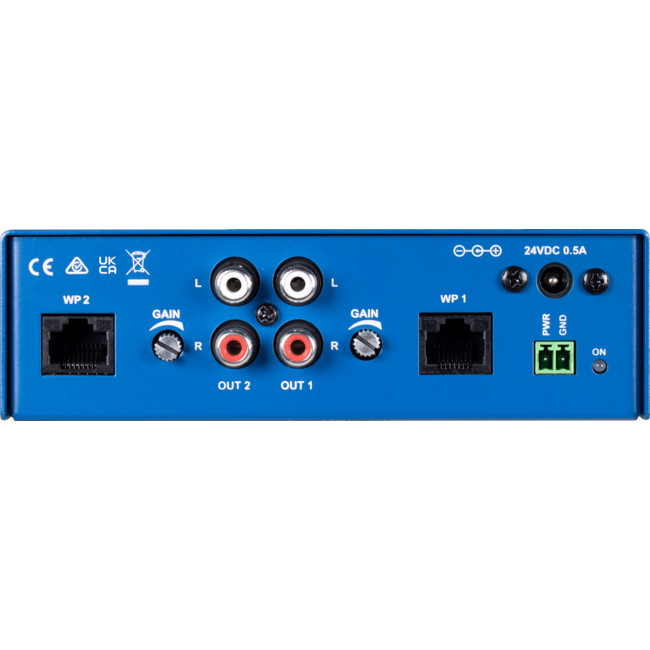 24V is provided to the wall panels and the wall panel balanced audio is converted into unbalanced audio for connection into any audio system.