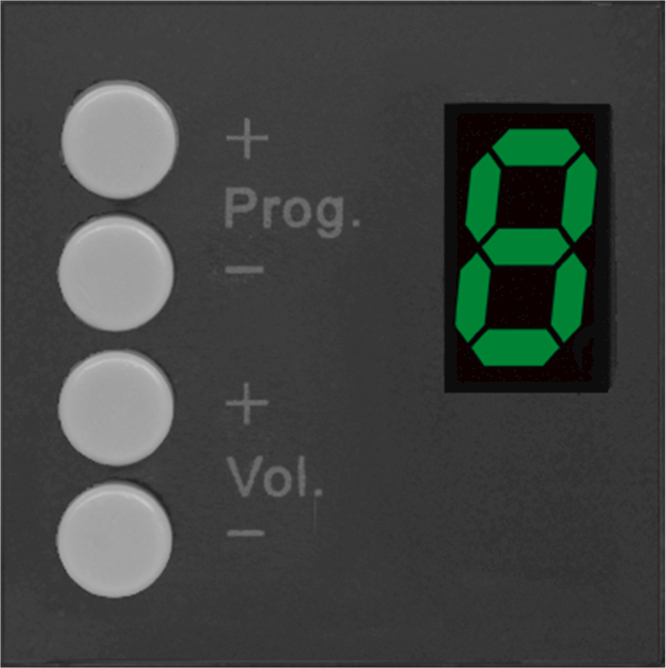 The 7 segment LED display indicates the current selected audio source (1-8) or volume.