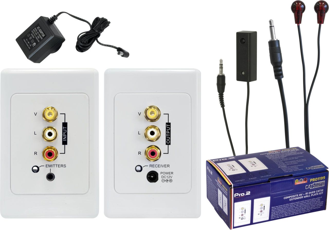 IR receiver and 1 dual IR emitters (PRO1142 also availableseparately) that deliver commands to 2 components, expandable up to 4 devices. The integrated IR-Repeater is made up of a receiver that picks up the signal from your remote, and emitters for sending the signals to the components. The IR emitters and AC adapter plugs into the Transmitting wall plate and the IR Receiver plugs into the Receiving wall plate. Both the IR emitters and receiver comes with a 10ft cable attached to it for your convince.