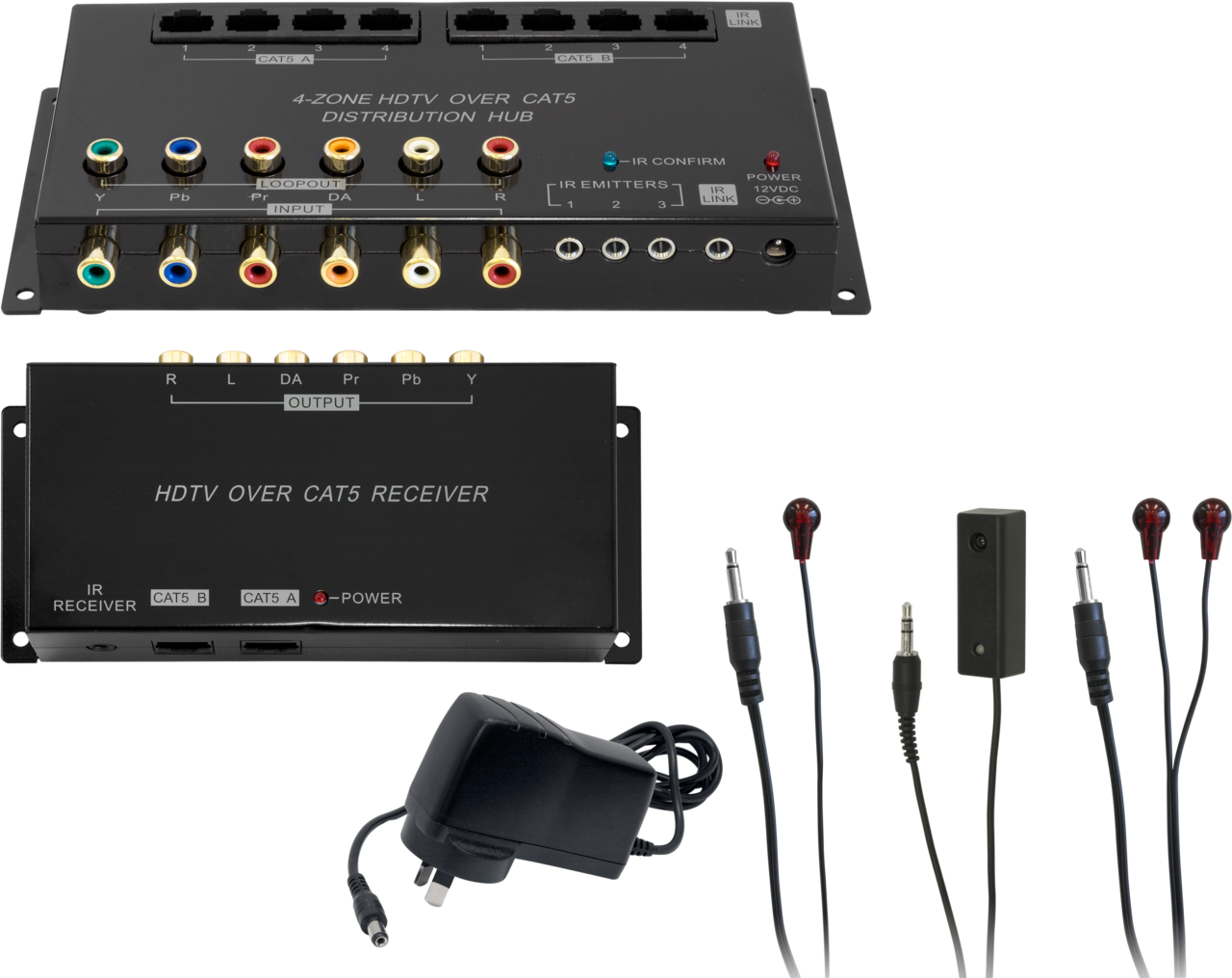 The PRO1247D allows you to extend component video, coaxial digital audio, stereo audio and IR signals to 4 different zones (expandable up to 8 with loop out function) using economical CAT5e cable.