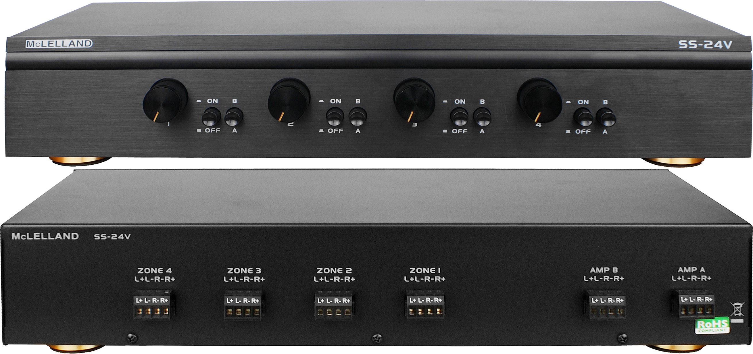 - A/B source selection for each room independently to choose between two source amplifiers