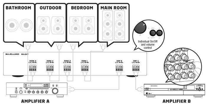 The independent A/B source enables the selection of two different amplifiers to anyroom in any combination simultaneously, all at varying volume levels. Ideal for both home and commercial installations.