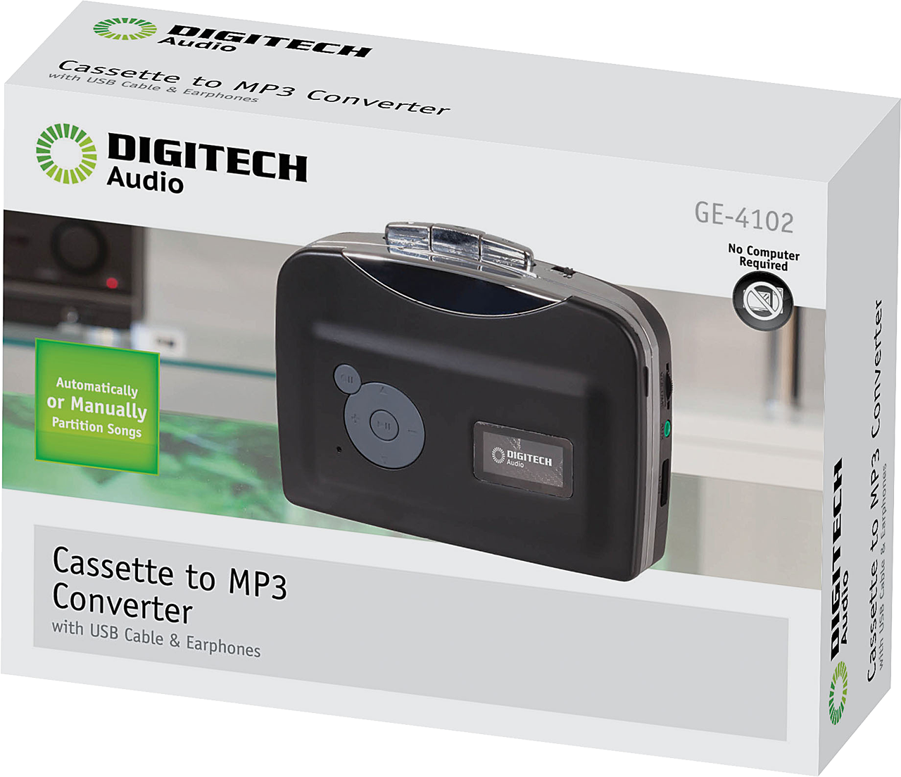 A totally self-contained cassette to MP3 converter. Simply insert your cassette tape, and your favourite USB drive, and you’re ready to go! You can manually partition songs, or let the intelligent circuitry figure it out for you. No computer required, and it couldn’t be easier! It’s battery powered (2 x AA) or power from a USB port (cable included). A set of earphones are included so you can listen while it’s working too. Features: