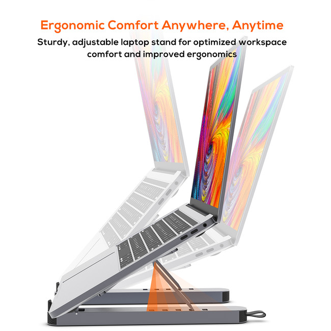 Our laptop stand is designed for maximum portability, with a foldable and adjustable height design. It's ideal for on-the-go professionals and those seeking to optimize their workspace. Simply adjust the height to your liking and enjoy ergonomic comfort anywhere, anytime.