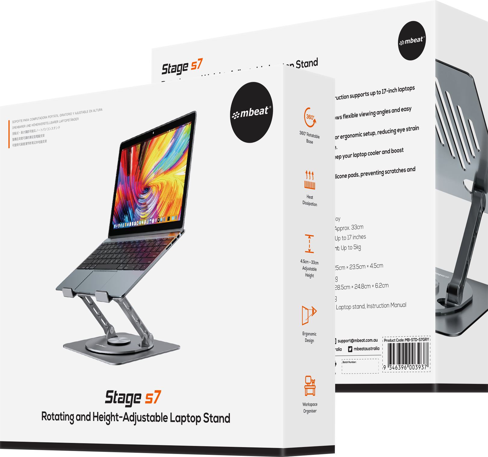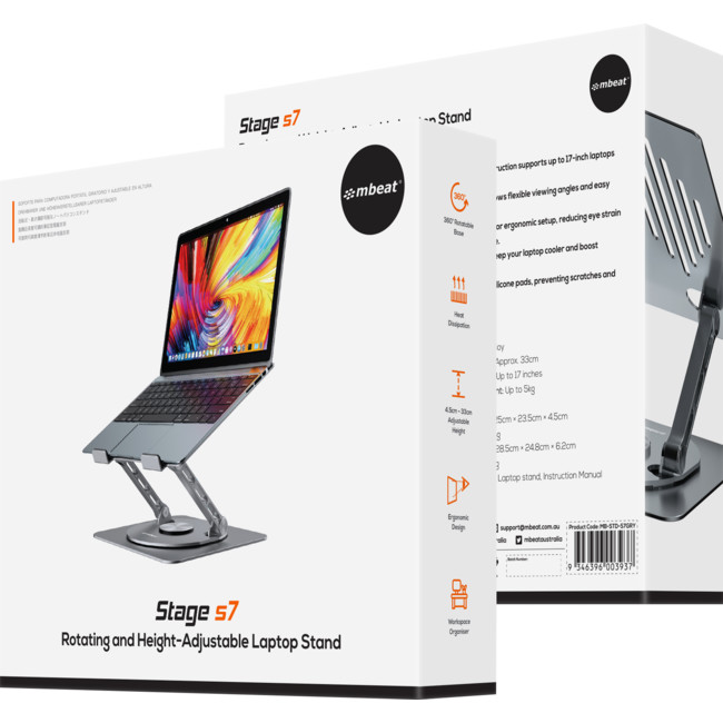 Enhance your workspace with the mbeat Stage S7 Rotating Laptop Stand. Ideal for professionals and students, it offers a robust, adjustable platform that supports ergonomic posture. With a sleek aluminium build and thoughtful design, it ensures your laptop stays cool and secure during prolonged use.