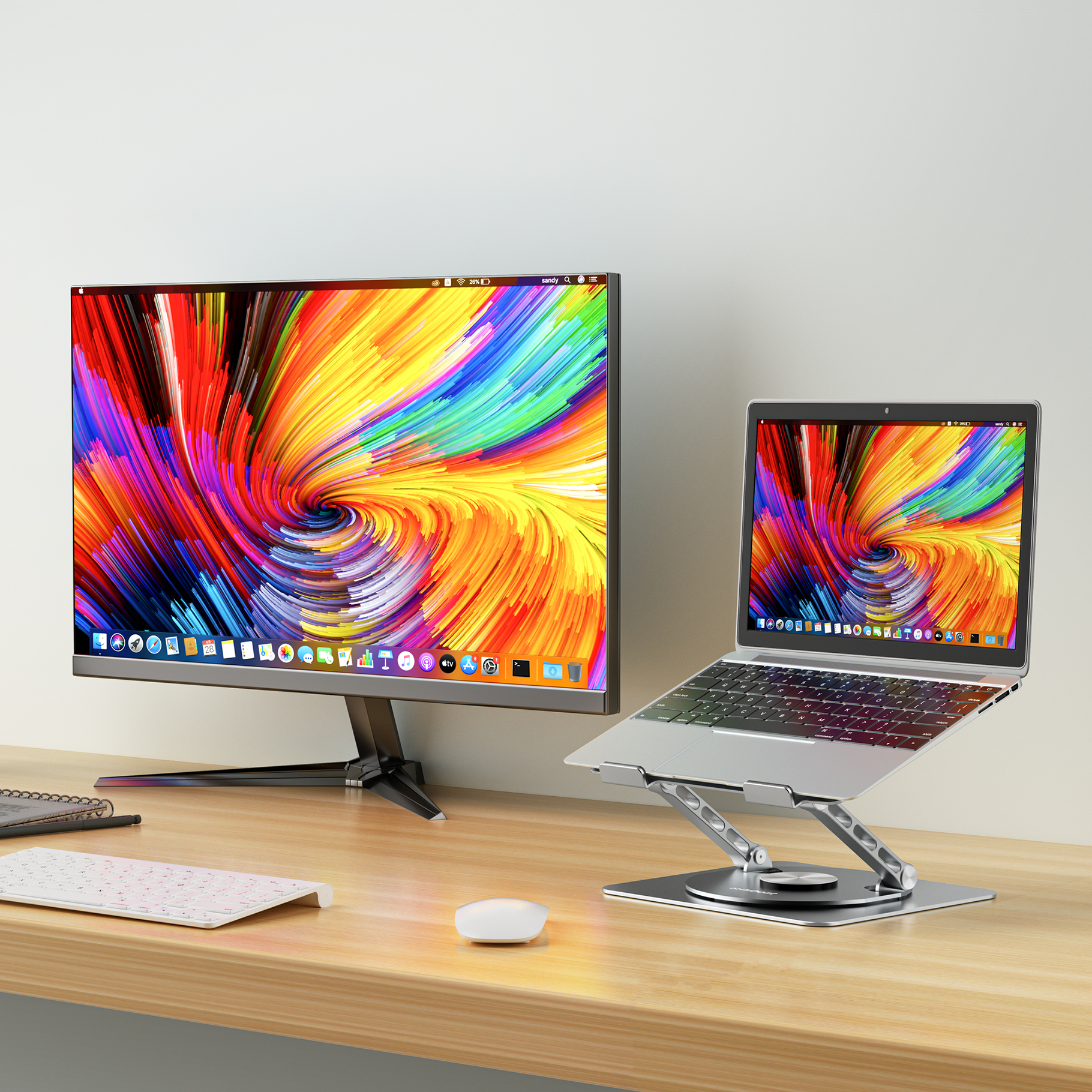 The stand’s fully rotating base offers effortless angle adjustments, allowing you to easily share your screen, find your ideal viewing position, and access your device’s USB ports with convenience.