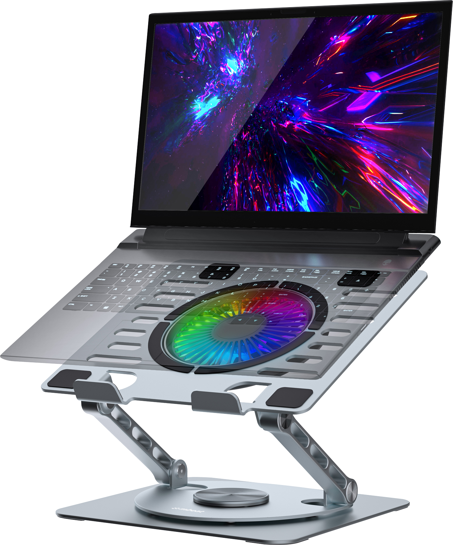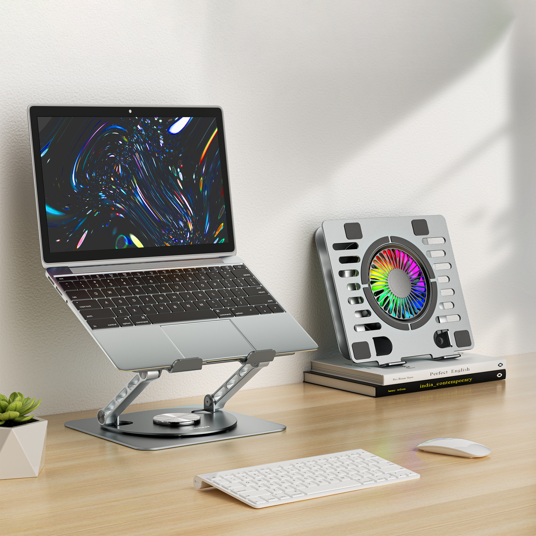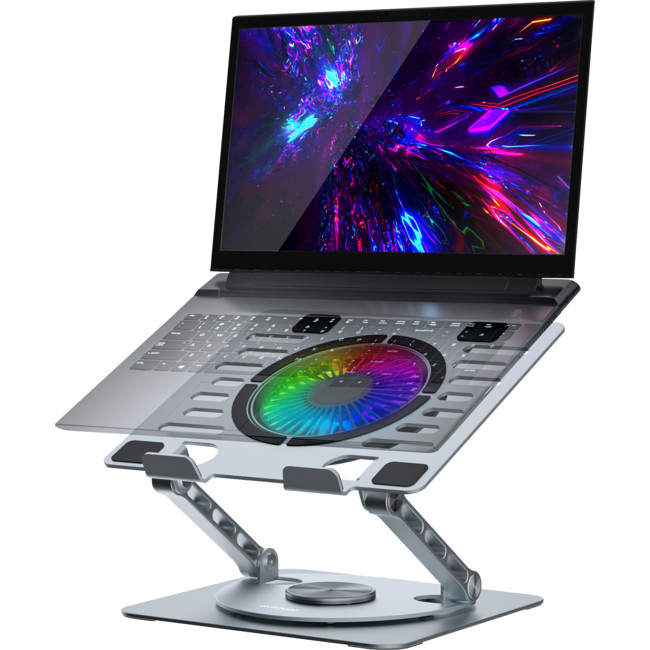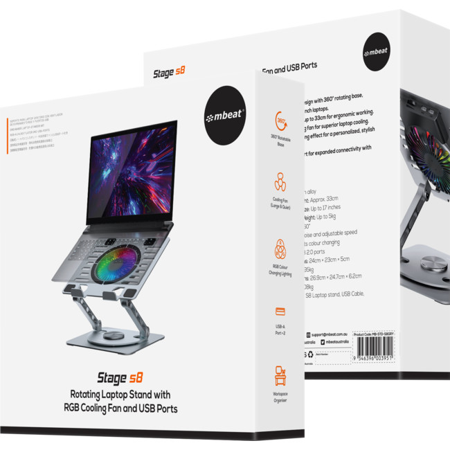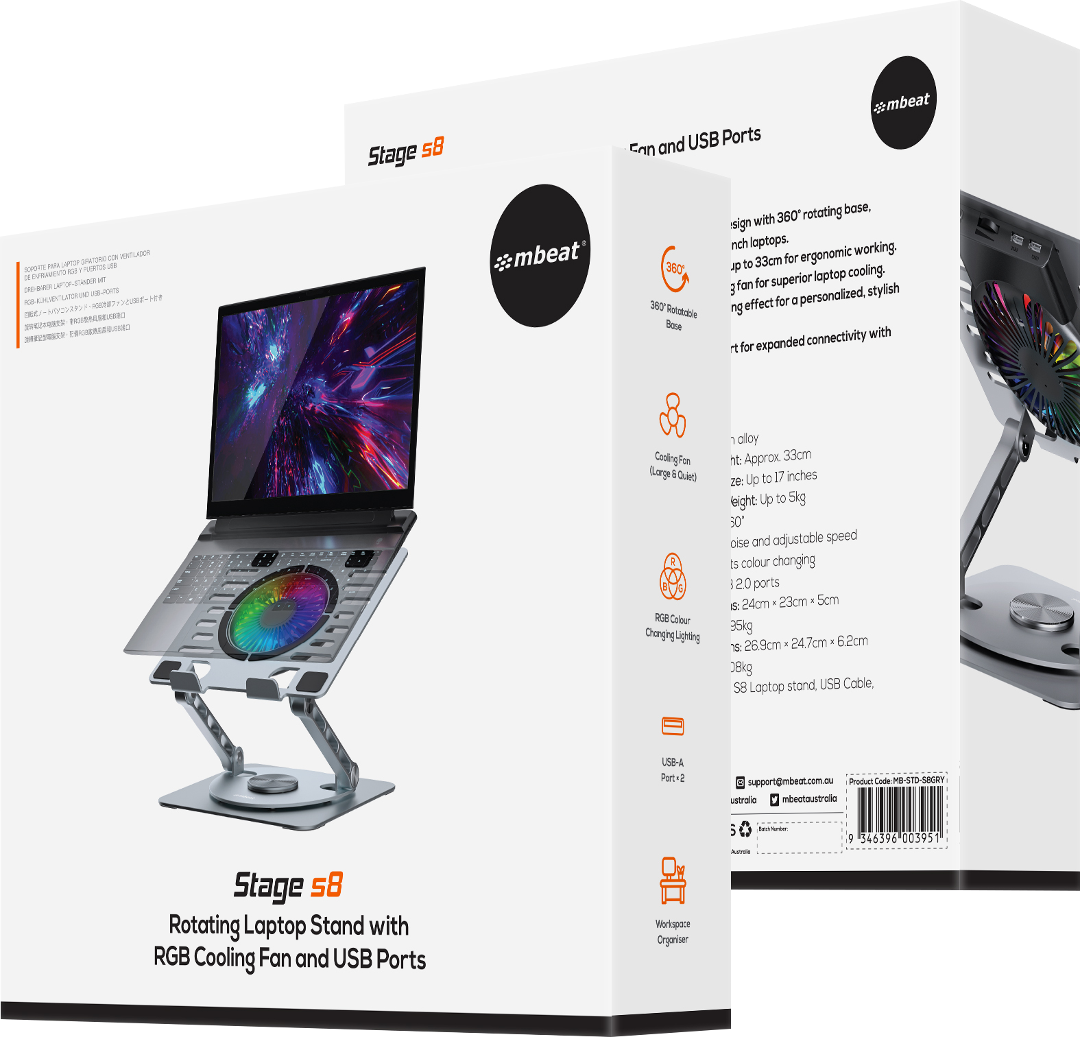 The mbeat Stage S8 boasts a robust aluminium design complemented by a 360° rotating base, adjustable height up to 33cm, a powerful cooling fan, stylish RGB lighting, and dual USB ports, offering ergonomic comfort and enhanced functionality for laptops up to 17 inches.
