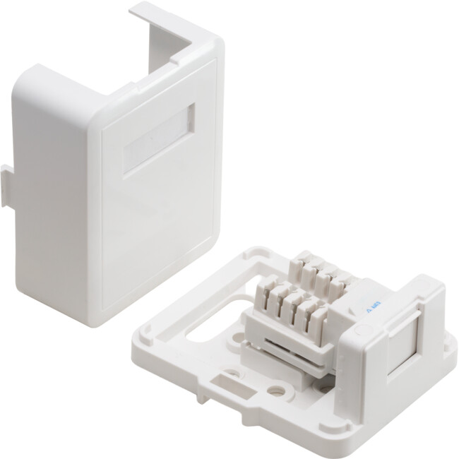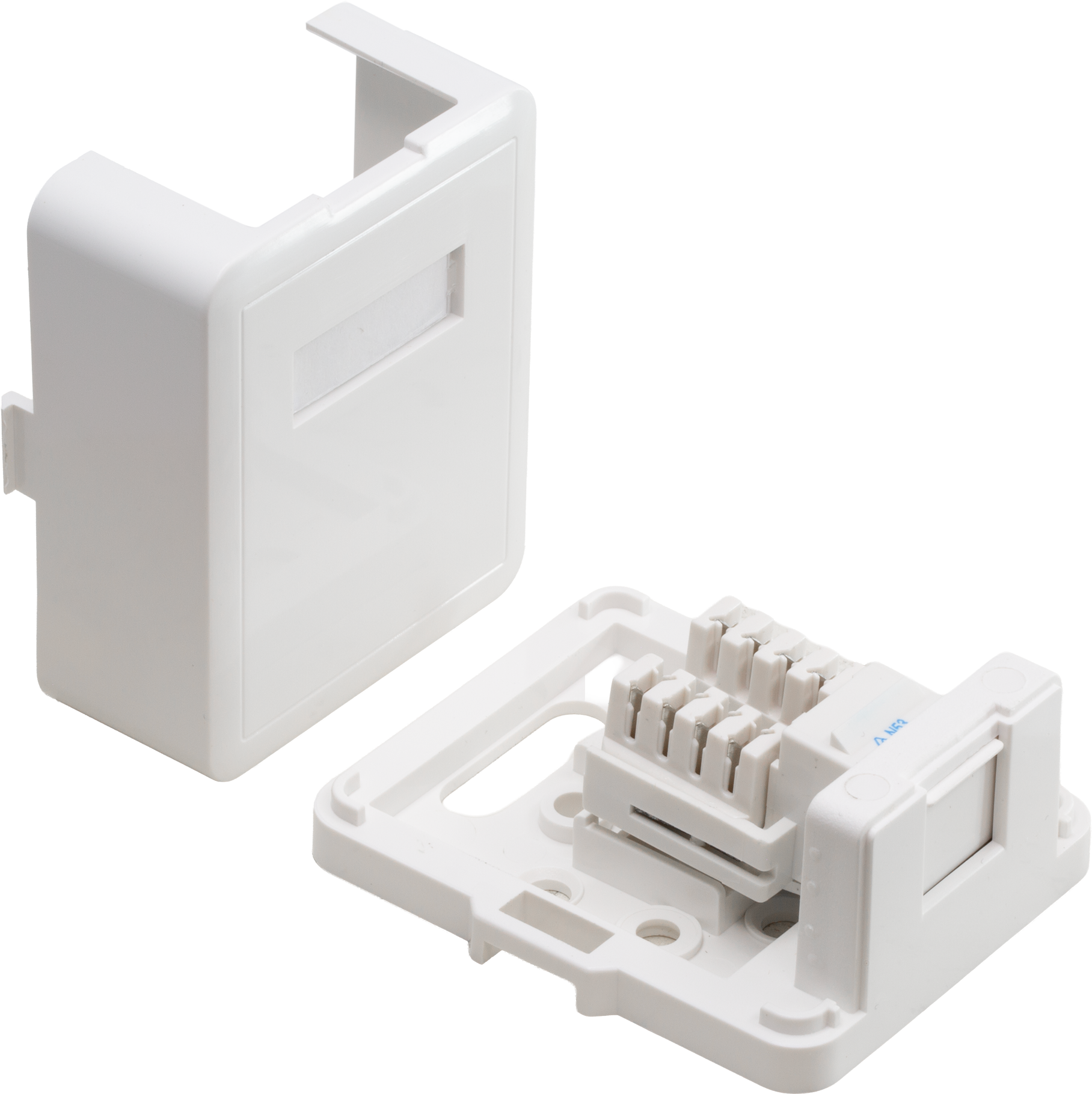 Skirting board surface mount U.S. 8P8C modular socket.Supplied with wood screw, and adhesive pad for instant mounting. < BR>- Clip on cover