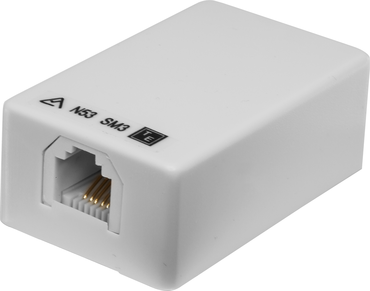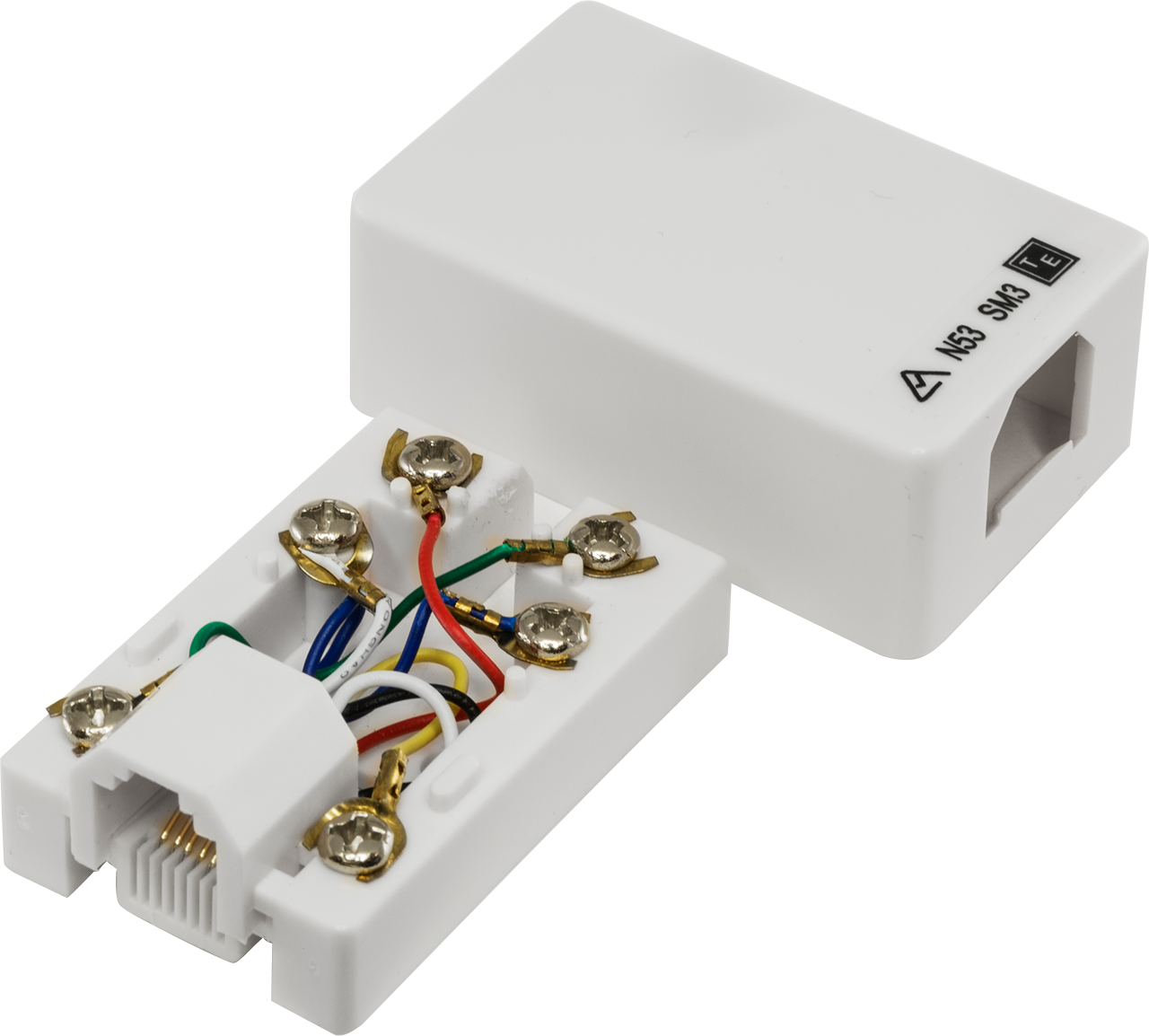 Skirting board surface mount U.S. 6P6C modular socket. Supplied with wood screw, and adhesive pad for instant mounting.