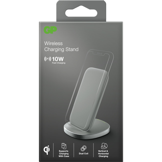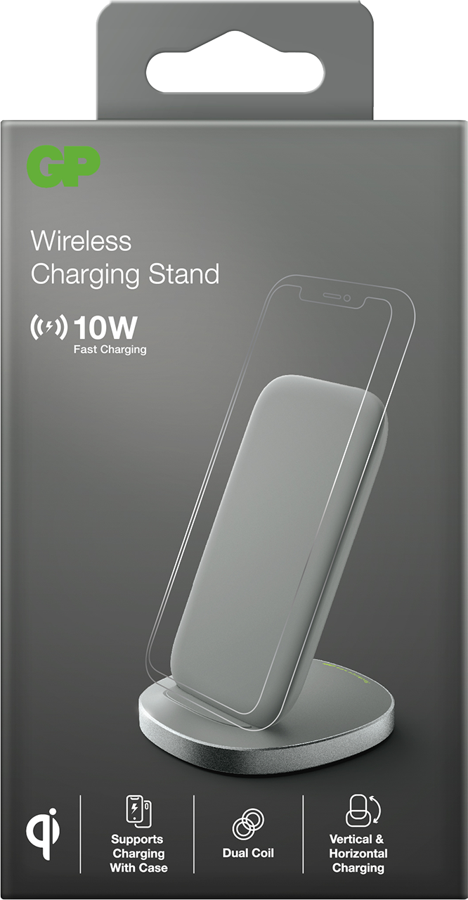 The GP Q-series wireless charging stand features a dusl coil design for use in both landscape and portrait while thedevice is charging.
