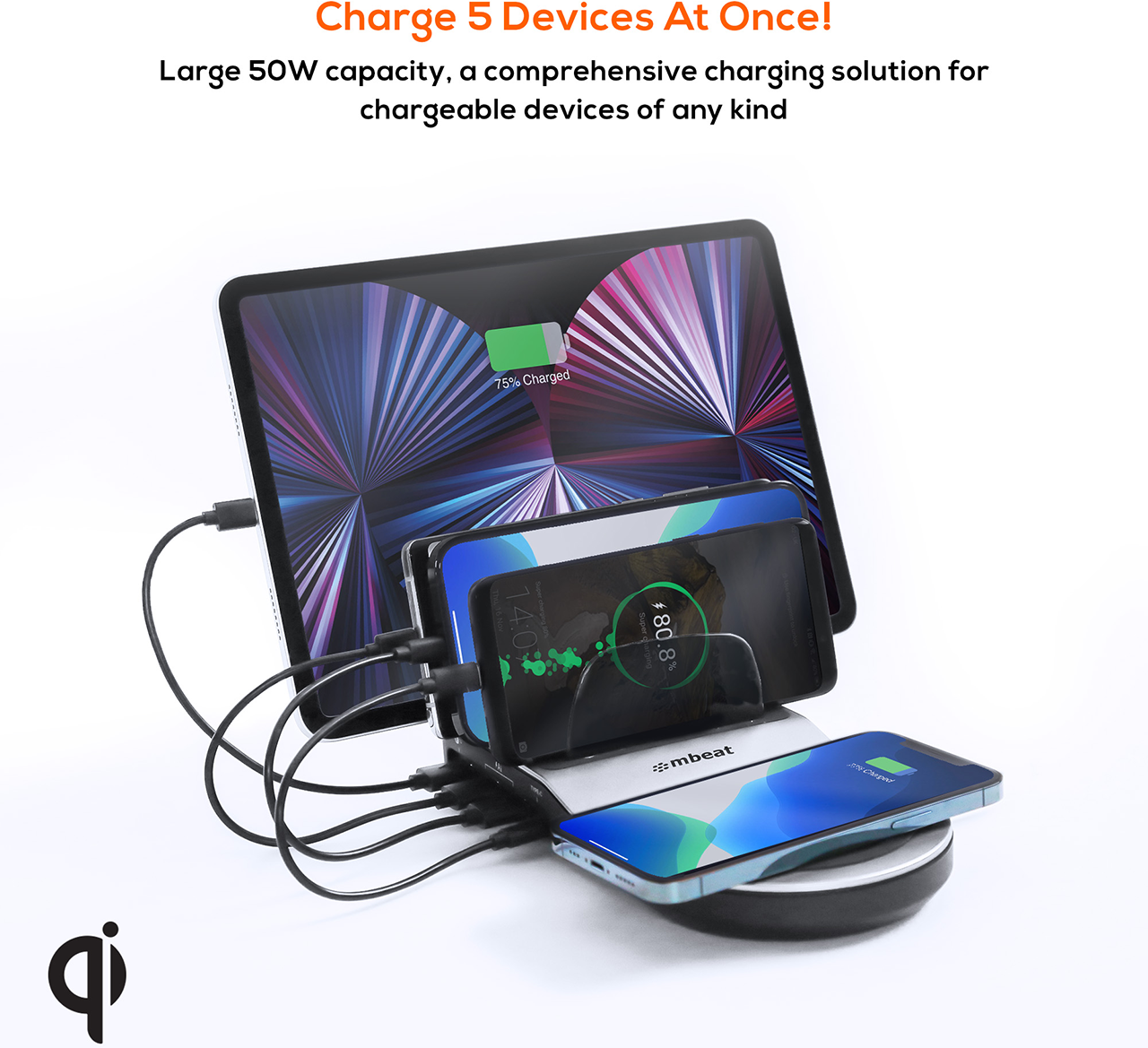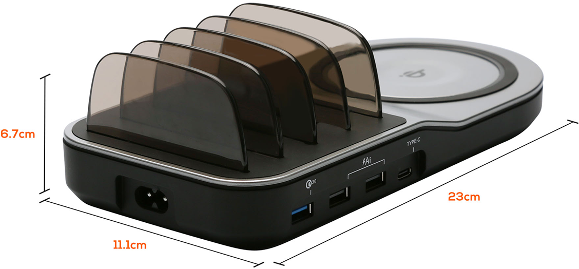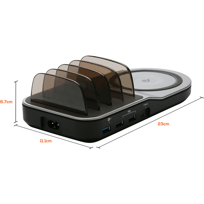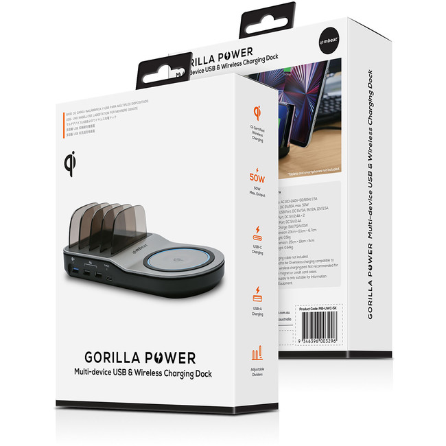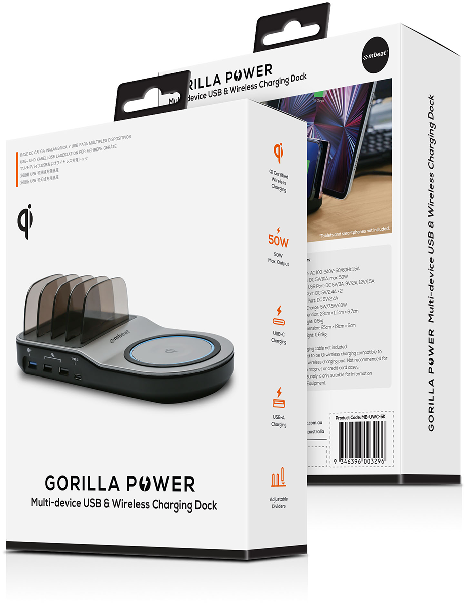 Features Comprehensive Charging Solution Featuring Quick Charge 3.0, smart USB charging, USB Type-C and Qi certified wireless charging to meet the ever-changing charging demand. Charge multiple devices in the same place! Charge Five Devices Simultaneously Offers a Quick Charge 3.0 port (up to 18W), two smart USB-A ports (up to 12W each), one USB Type-C port (up to 12W) anda Qi certified wireless charger (up to 10W) to charge five devices simultaneously. Universal Wireless Charging Enjoy the ultimate wireless charging freedom with Qi certified wireless charging; simply place your Qi compatible device on the charging pad for fast and easy charging up to 10W. Stay Charged & Organized This Gorilla Power charging dock helps you manage multiple devices charged all in one place, perfect at home, at work,and more! Keep everything charged and handy at all times! Specifications