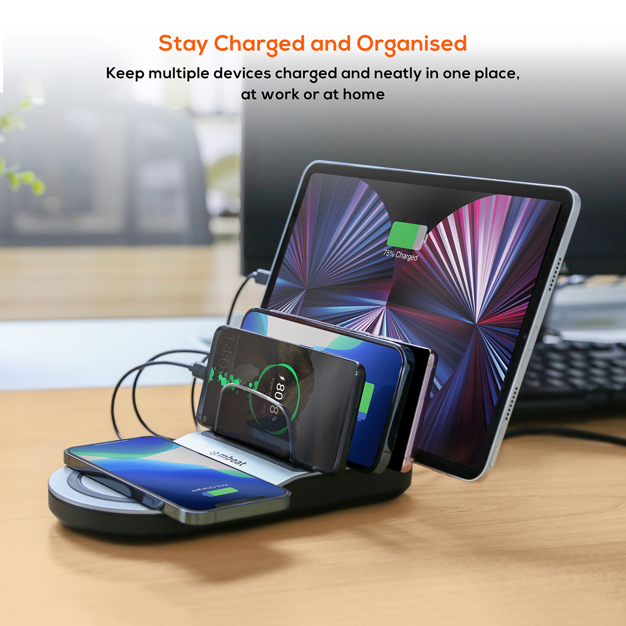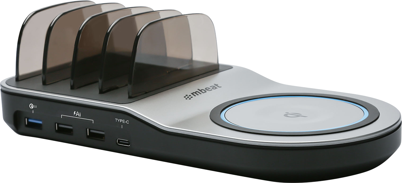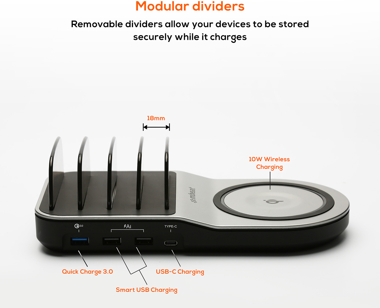 Features Comprehensive Charging Solution Featuring Quick Charge 3.0, smart USB charging, USB Type-C and Qi certified wireless charging to meet the ever-changing charging demand. Charge multiple devices in the same place! Charge Five Devices Simultaneously Offers a Quick Charge 3.0 port (up to 18W), two smart USB-A ports (up to 12W each), one USB Type-C port (up to 12W) anda Qi certified wireless charger (up to 10W) to charge five devices simultaneously. Universal Wireless Charging Enjoy the ultimate wireless charging freedom with Qi certified wireless charging; simply place your Qi compatible device on the charging pad for fast and easy charging up to 10W. Stay Charged & Organized This Gorilla Power charging dock helps you manage multiple devices charged all in one place, perfect at home, at work,and more! Keep everything charged and handy at all times! Specifications