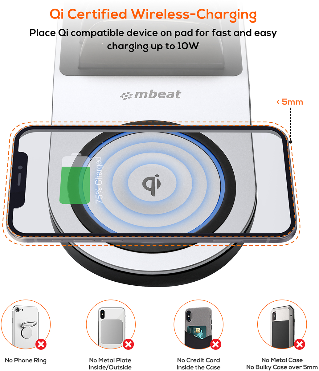* Device charging cable not included. * Devices need to be Qi wireless charging compatible to work on the wireless charging pad. Not recommended for devices with magnet or credit card cases. * This power supply is only suitable for Information Technology Equipment.