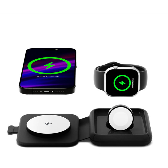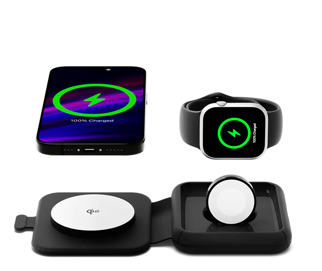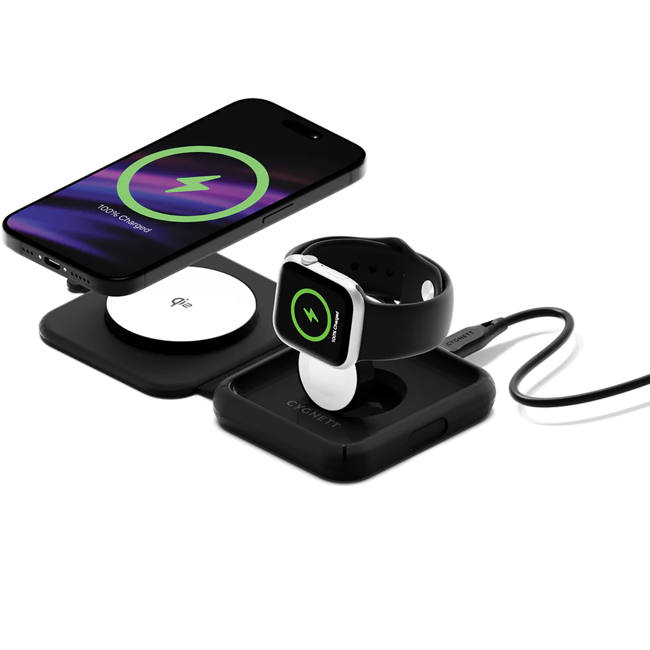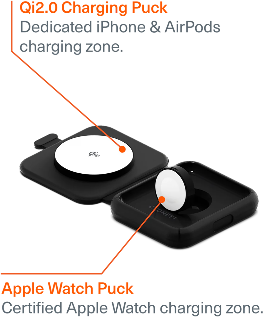 This sleek 2-in-1 Qi2.0 wireless charger is the perfect travel companion for your Apple devices. With two dedicated charging zones, you can power up your iPhone and Apple Watch at the same time, or easily switch to charge your AirPods. Weighing just 123g, it folds for easy portability and includes a 1.2m USB-C to USB-C cable. Works best with a 25W wall charger. Travel lighter, charge faster.