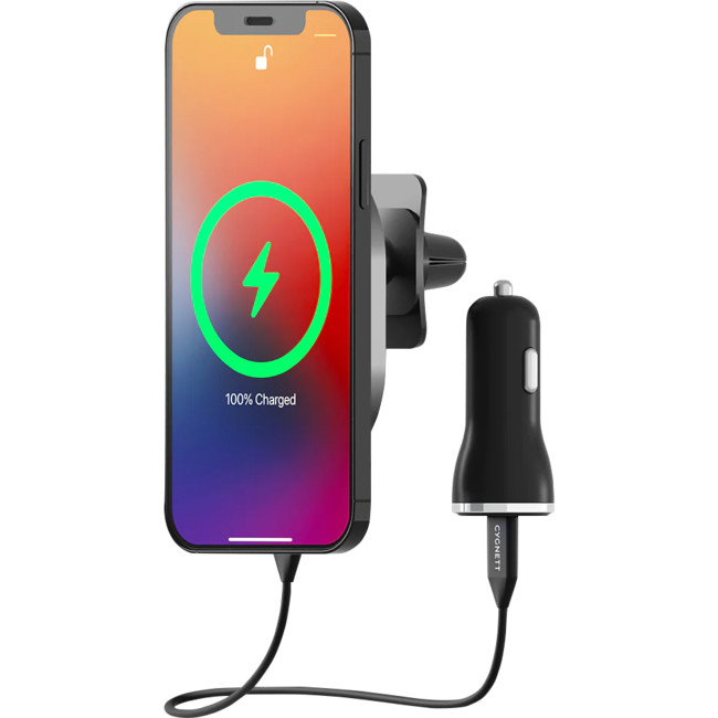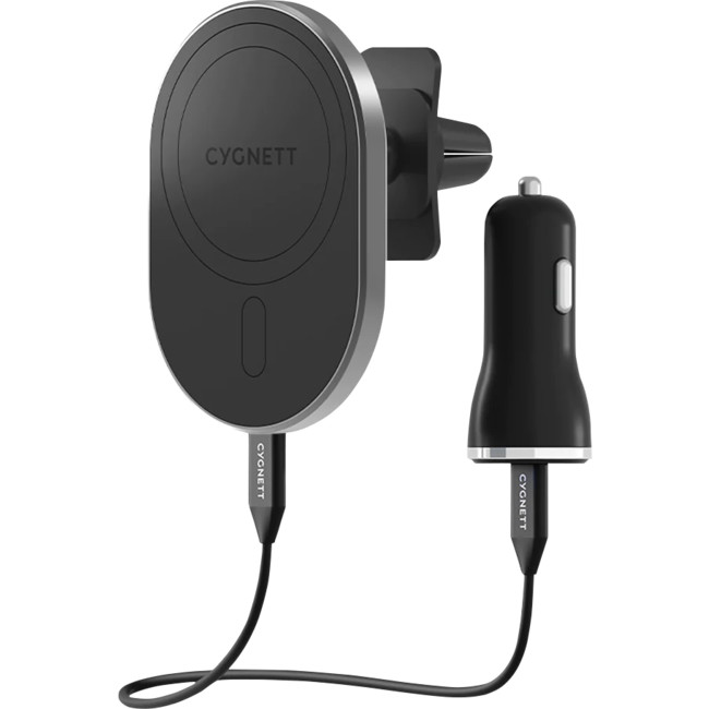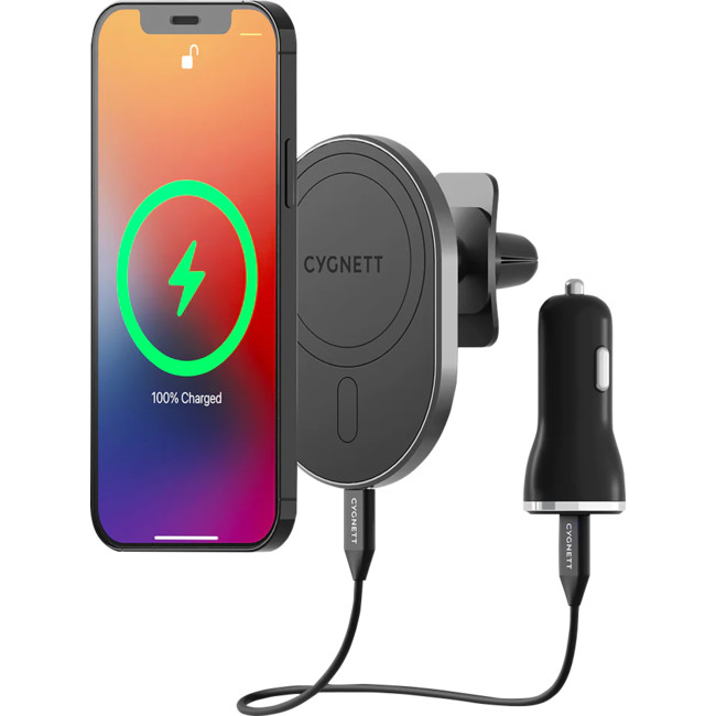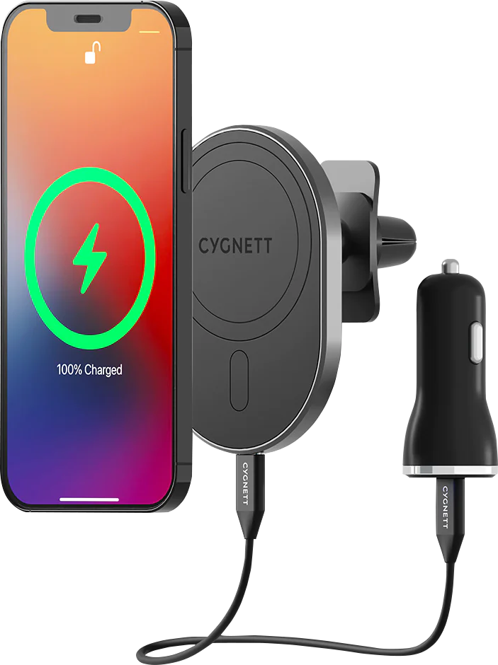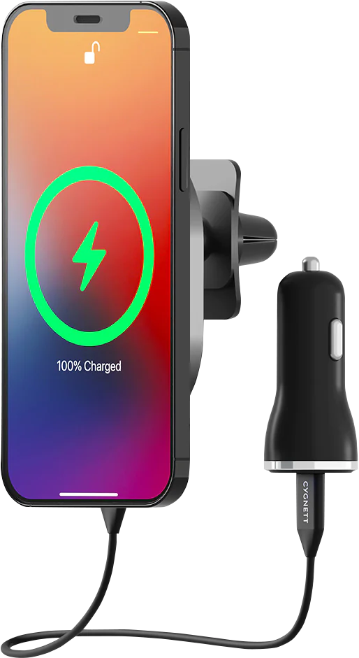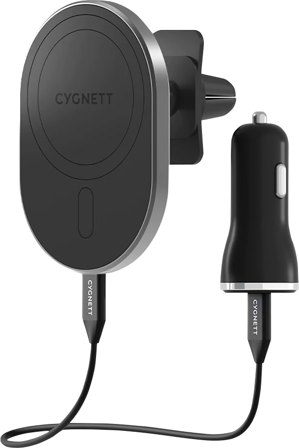 Compatible with MagSafe The magnets built inside this car charger and holder perfectly aligns with MagSafe technology inside iPhone 12, 13 and 14 to allow your phone to maintain the perfect charging position. This car charger is compatible with official MagSafe and Magnetic charging accessories. Up to 15W fast charging Simply place your phone on the mounting pad for instantaneous charging. MagHold will snap your phone into perfect charging position and support up to 15W fast wireless charging. One ring to charge them all No iPhone 12 or 13? No worries, simply apply our sleek attachment ring to the back of any wireless capable phone and experience fast, magnetic wireless charging (7.5W Max). - iPhone 11 - Samsung S Series - Pixel 5 Strong hold The strong magnets combine with MagSafe technology to make sure your phone stays safe and secure over every bump. Compatible with MagSafe Cases. Adjustable view Charge and mount your phone in the perfect viewing position for navigation, with 180° rotation for adjusting your phone in either landscape or portrait mode.