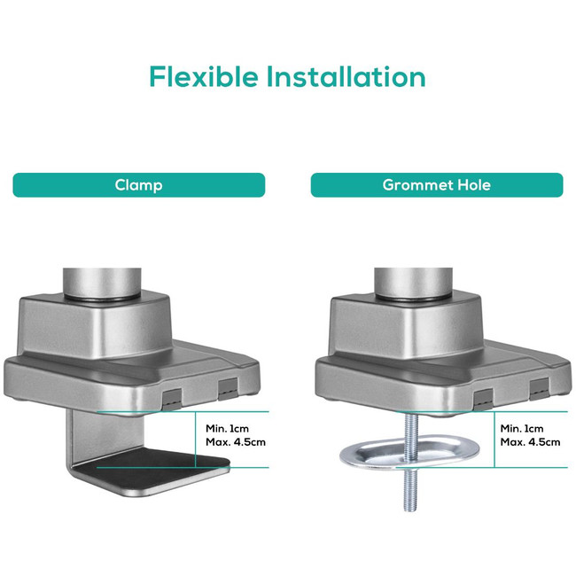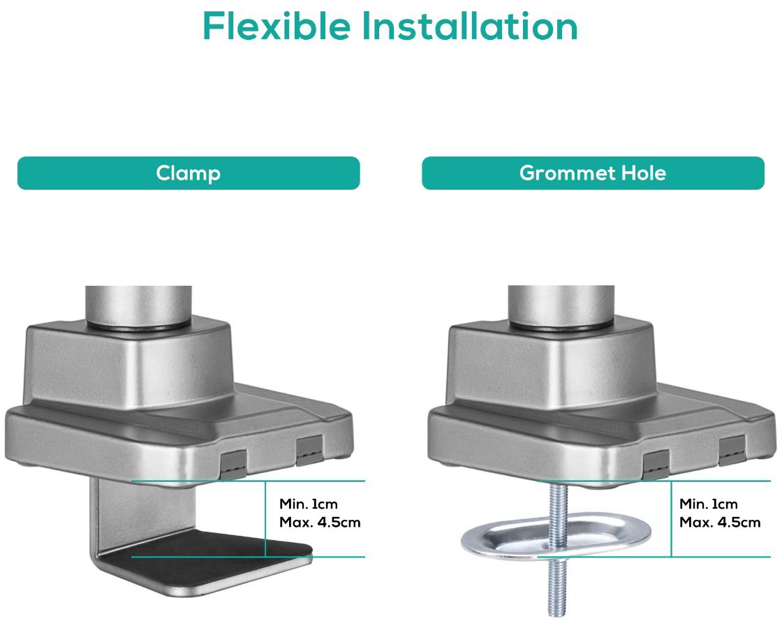 This activiva monitor arm can be mounted using either the included desk clamp or grommet, giving you the flexibility to choose the most suitable option for your setup.