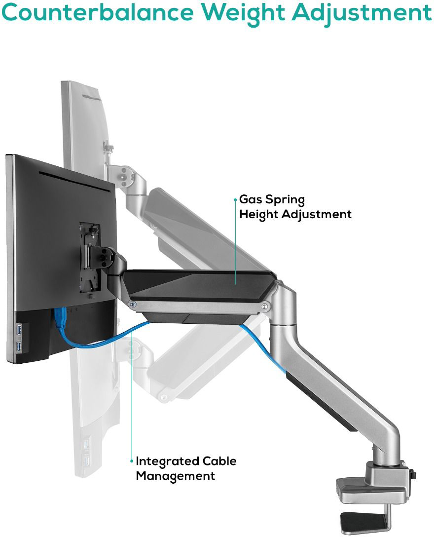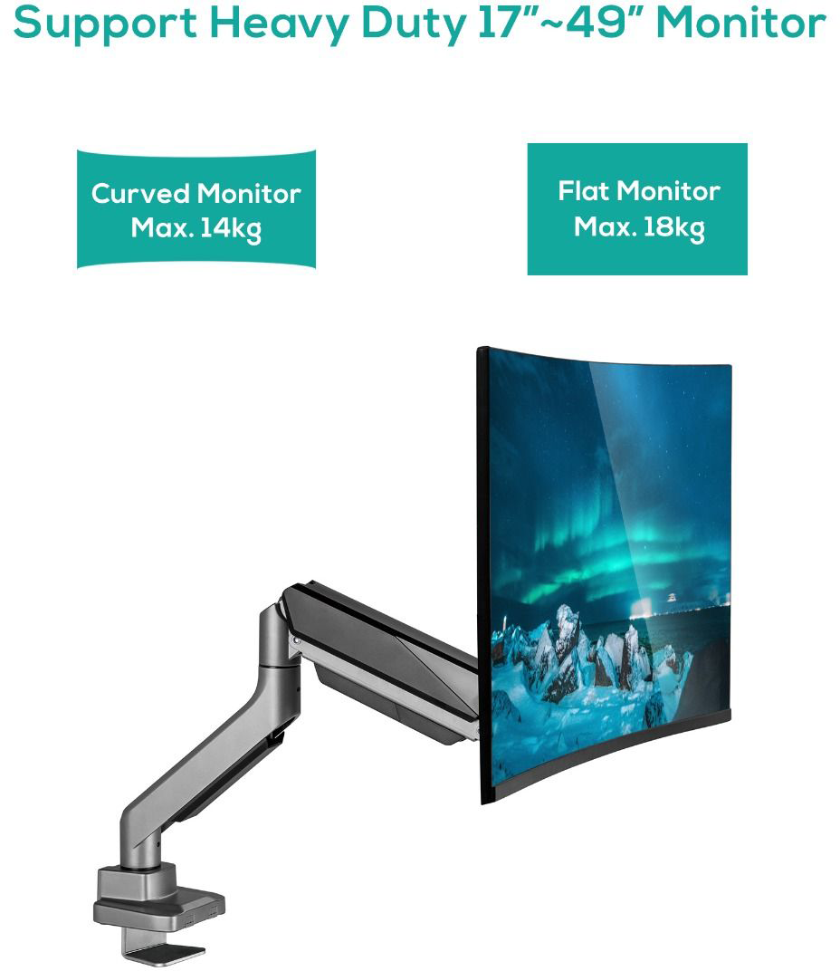 This Heavy-Duty Gas Spring Monitor Arm features a gas spring mechanism that perfectly counterbalances the weight of most 17"-49'' flat panel or curved monitors weighing up to 18kg and 14kg per screen, respectively; providing easy and smooth adjustment for optimal viewing comfort, reducing strain on your eyes, neck, and shoulders.