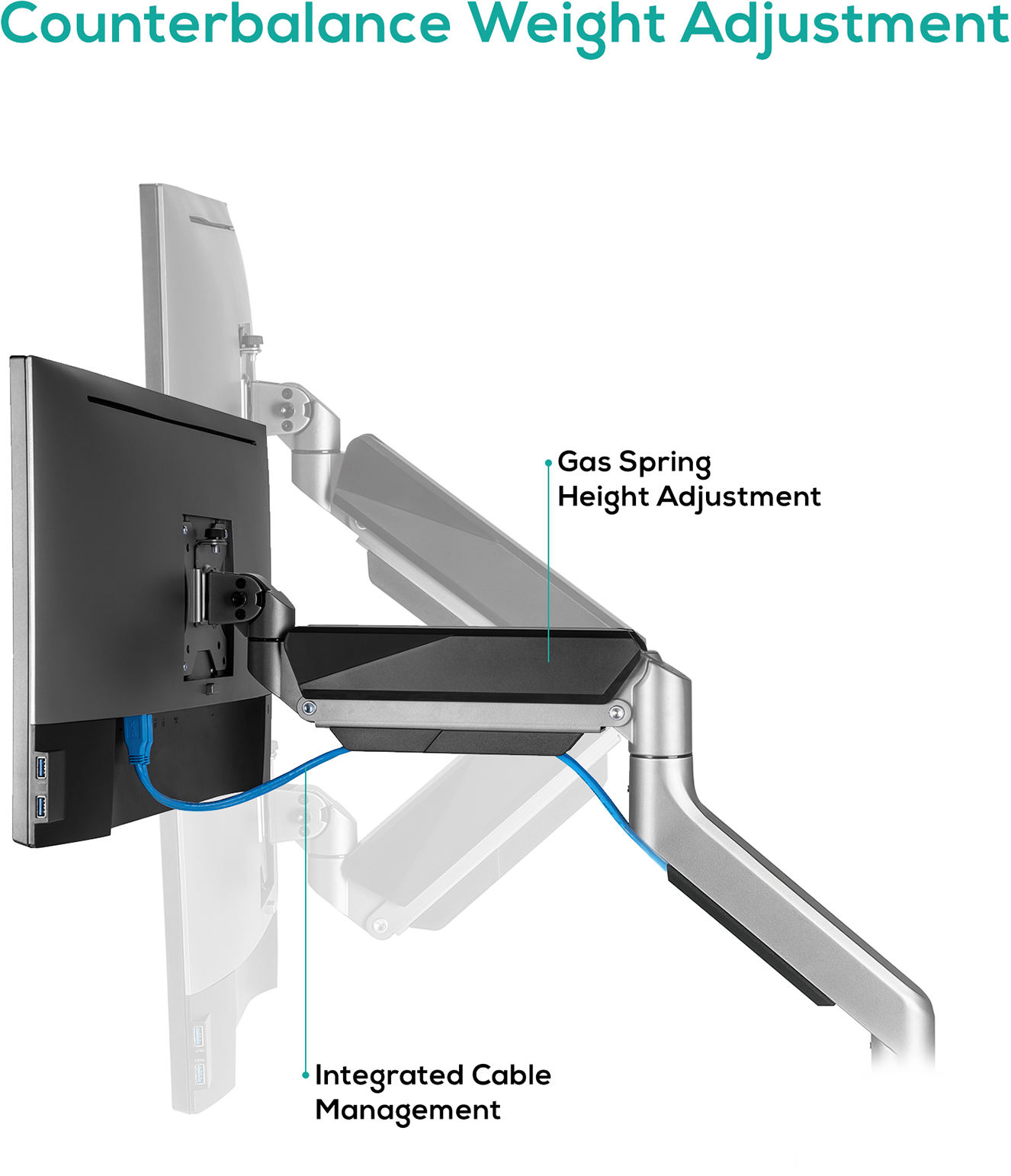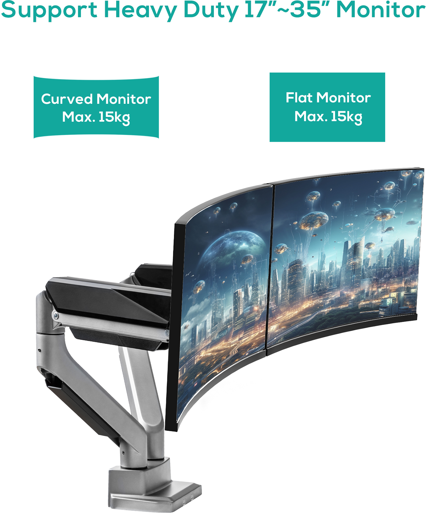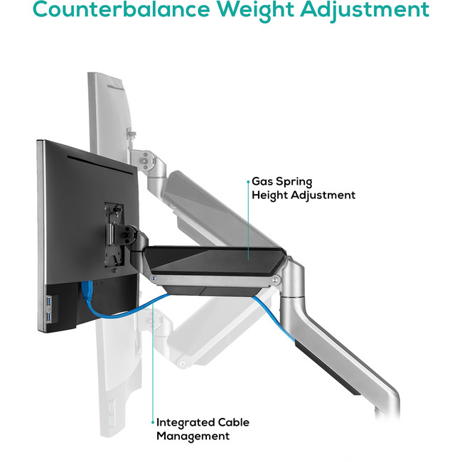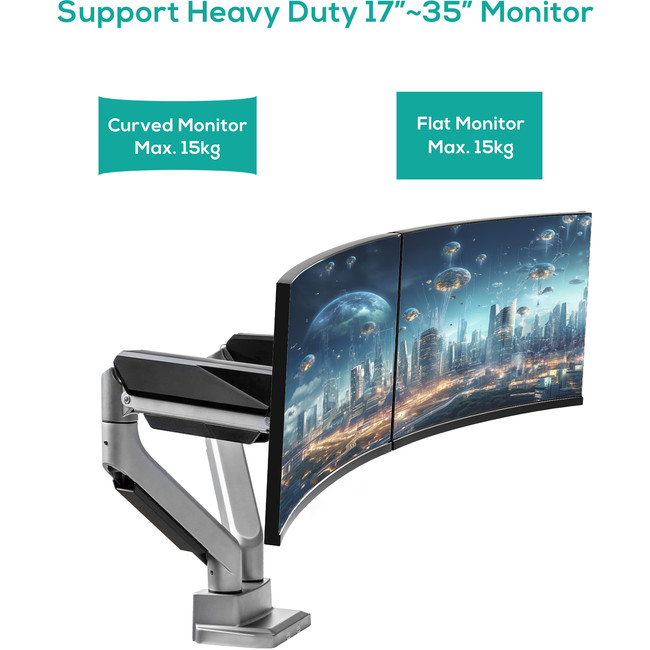 This Heavy-Duty Gas Spring Monitor Arm features a dual gas spring mechanism that perfectly counterbalances the weight of most 17”-35’’ flat panel or curved monitors, supporting a maximum weight of up to 15kg. It provides easy and smooth adjustment for optimal viewing comfort, reducing strain on your eyes, neck, and shoulders.