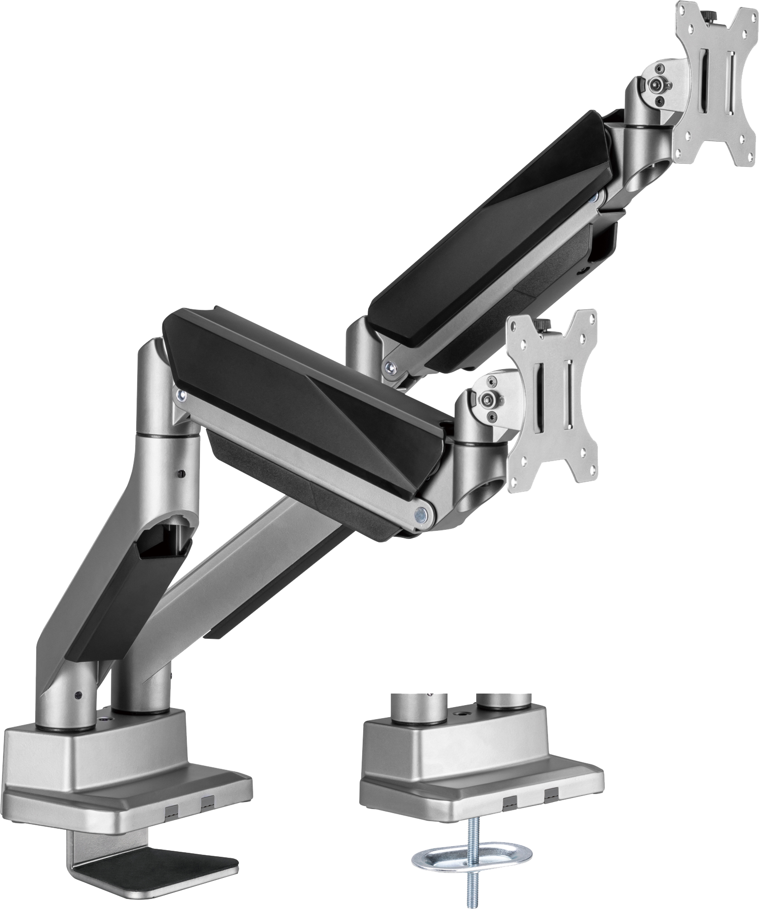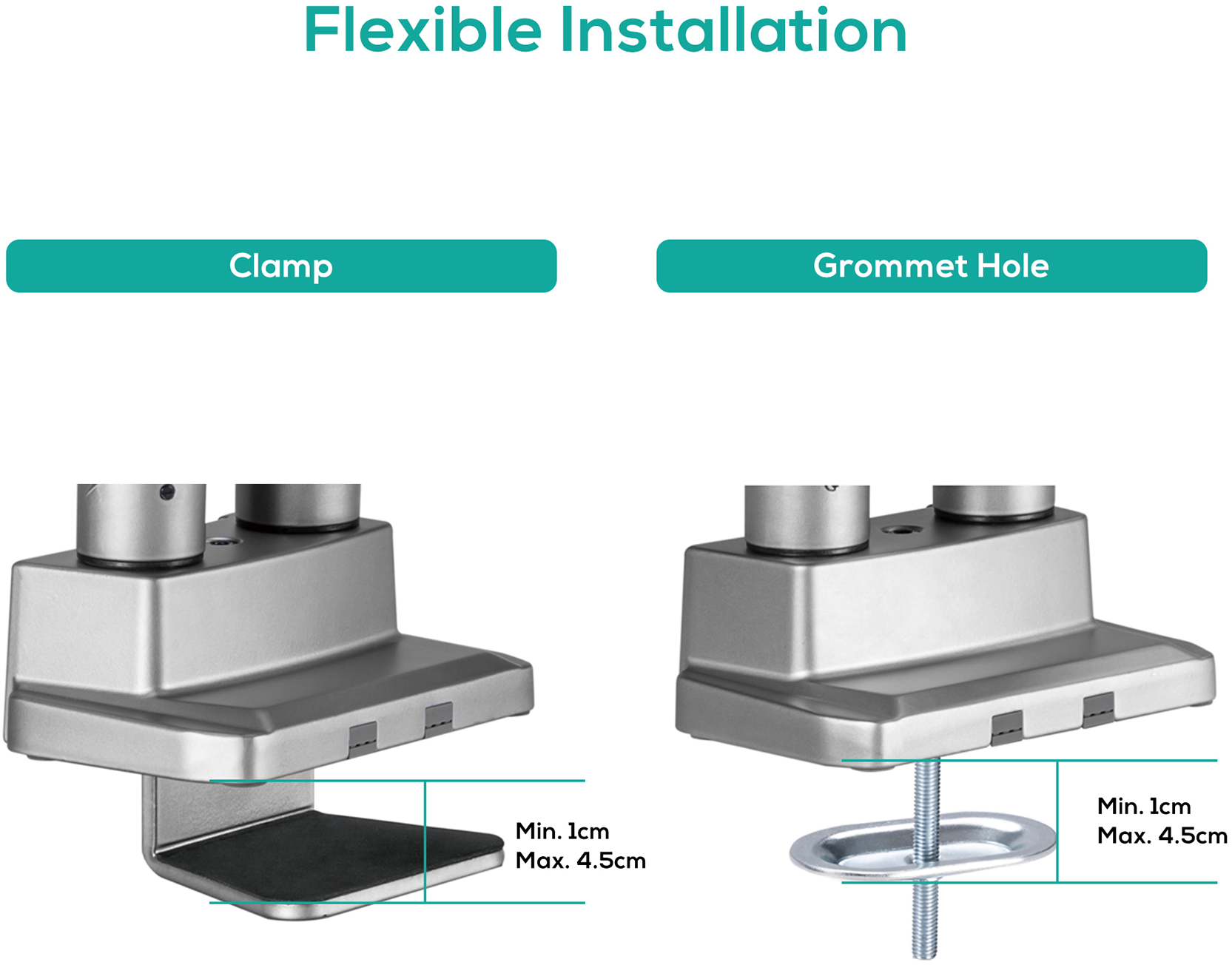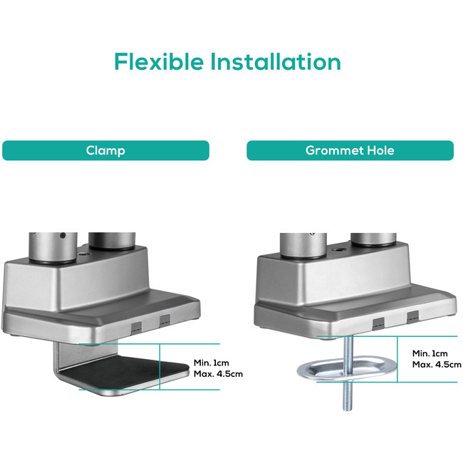 This heavy-duty dual screen monitor arm can be mounted using either the included desk clamp or grommet, giving you the flexibility to choose the most suitable option for your setup.