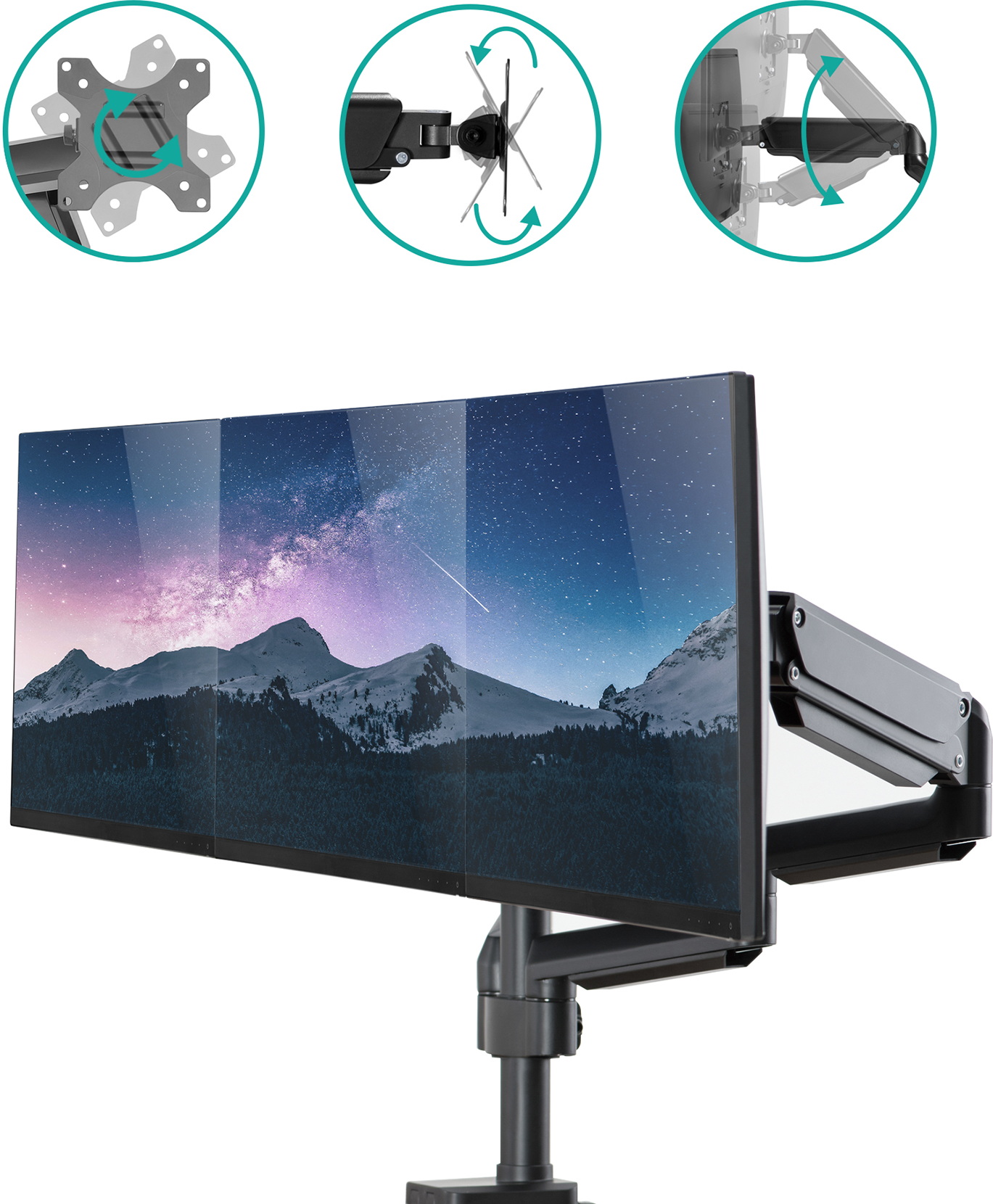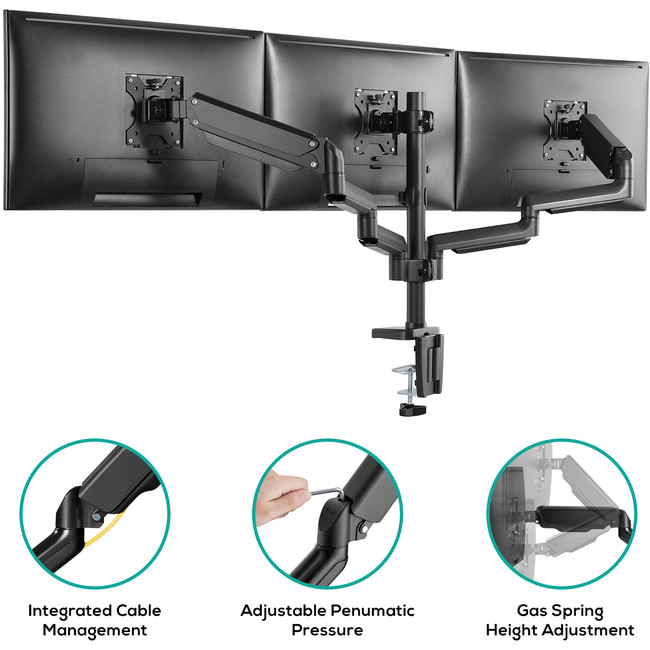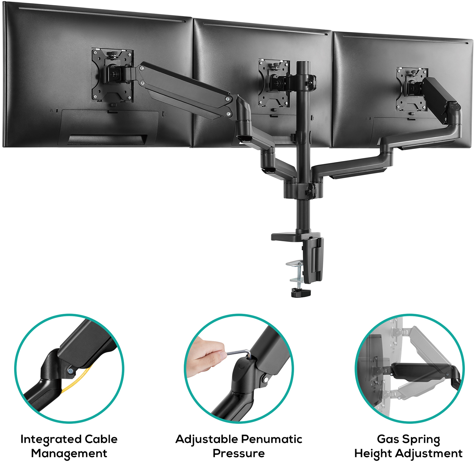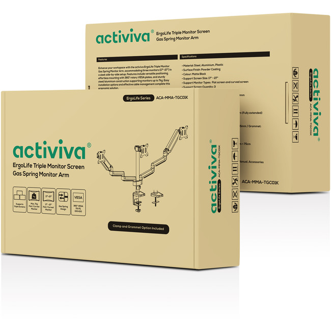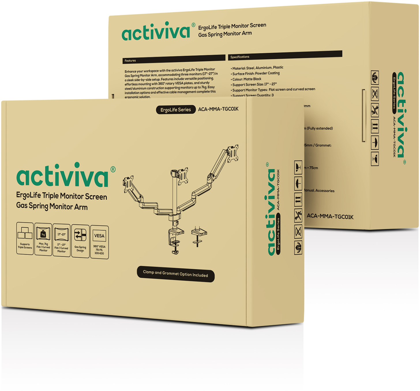 Enhance your workspace with the activiva ErgoLife Triple Monitor Gas Spring Monitor Arm, accommodating three monitors (17”-27”) in a sleek side-by-side setup. Features include versatile positioning, effortless mounting with 360° rotary VESA plates, and sturdy steel/aluminium construction supporting monitors up to 7kg. Easy installation options and effective cable management complete this ergonomic solution.