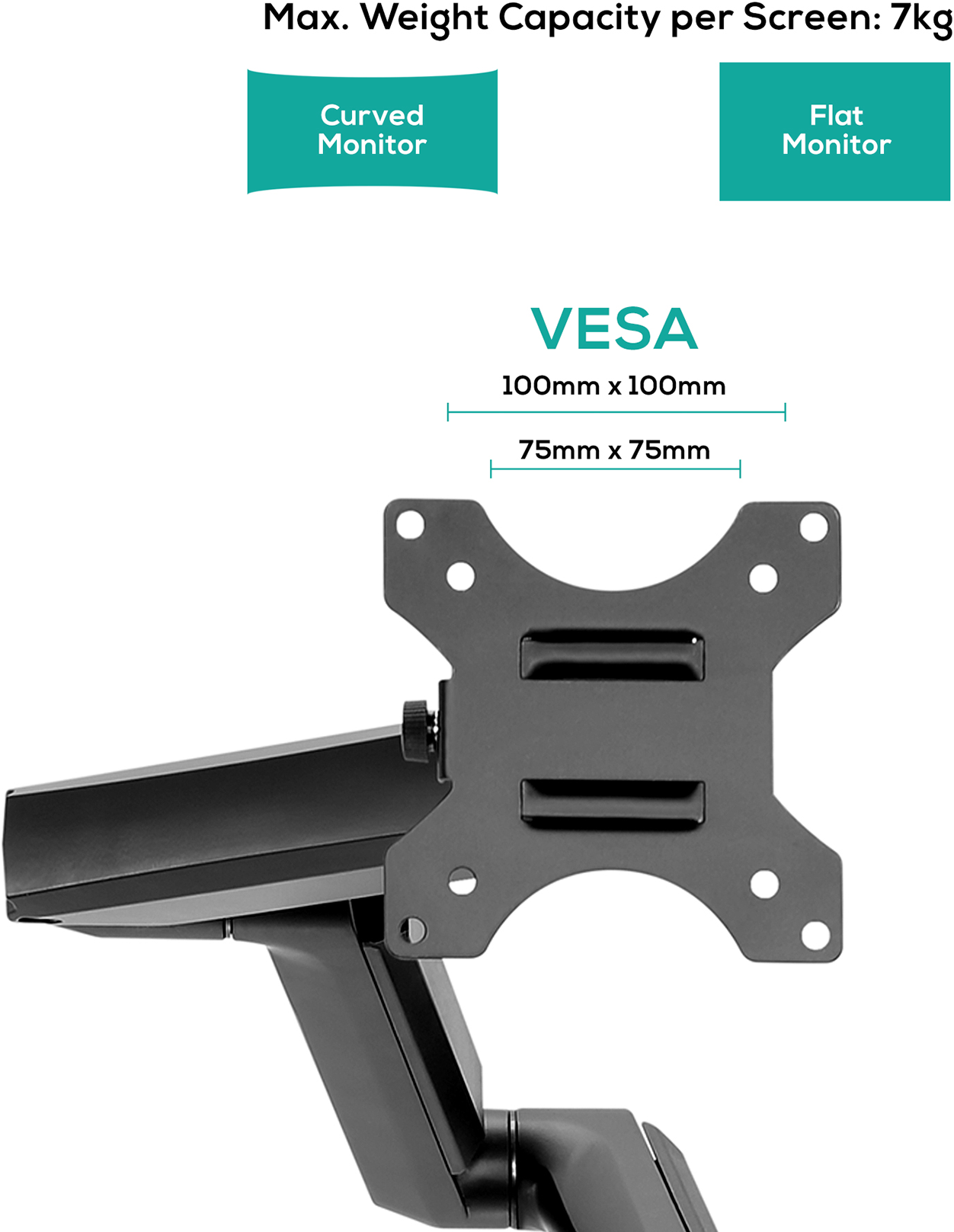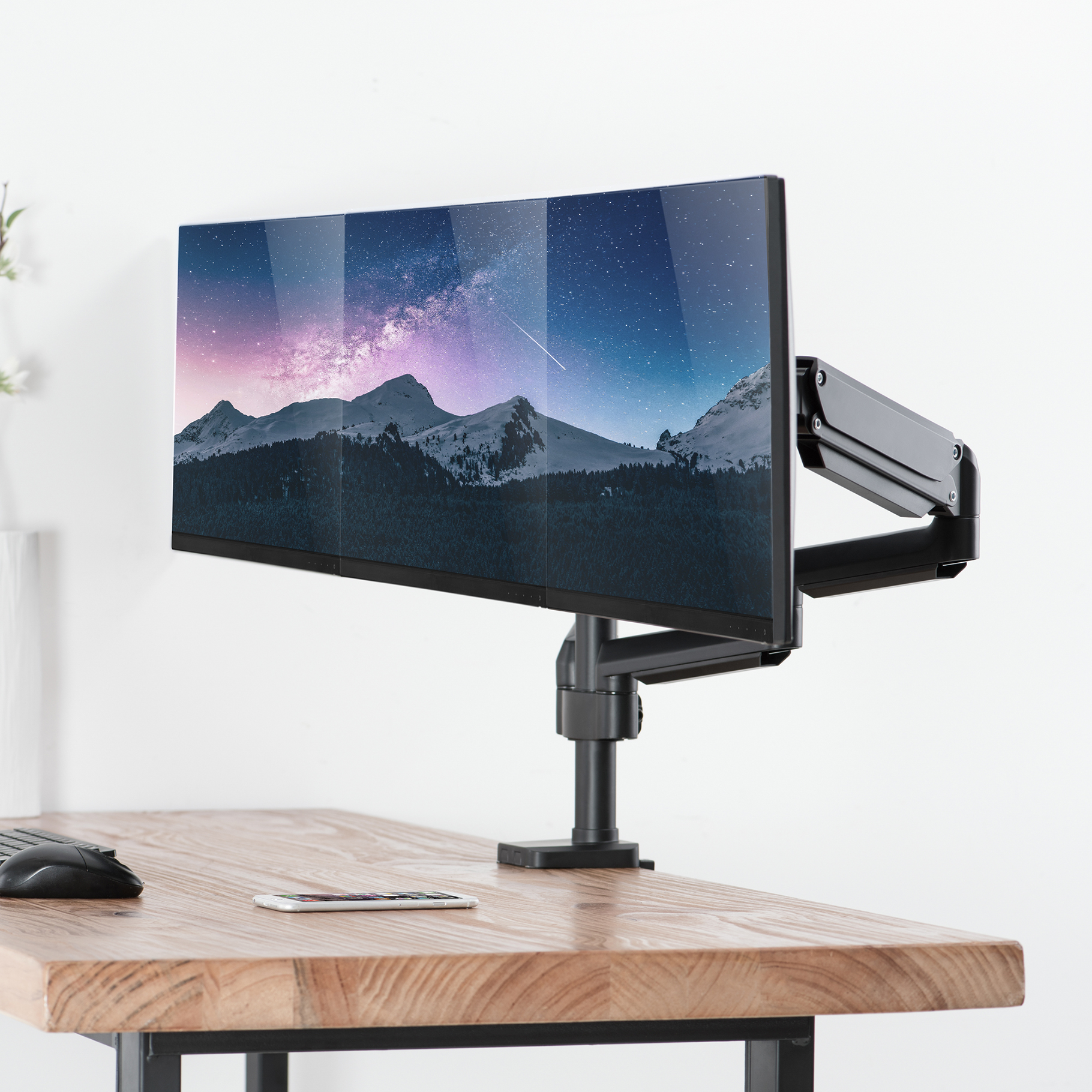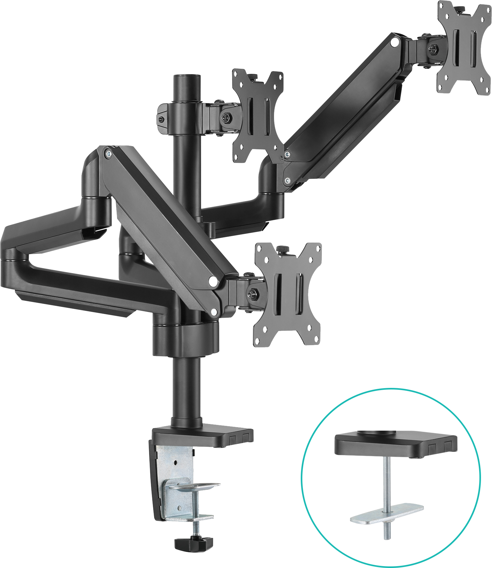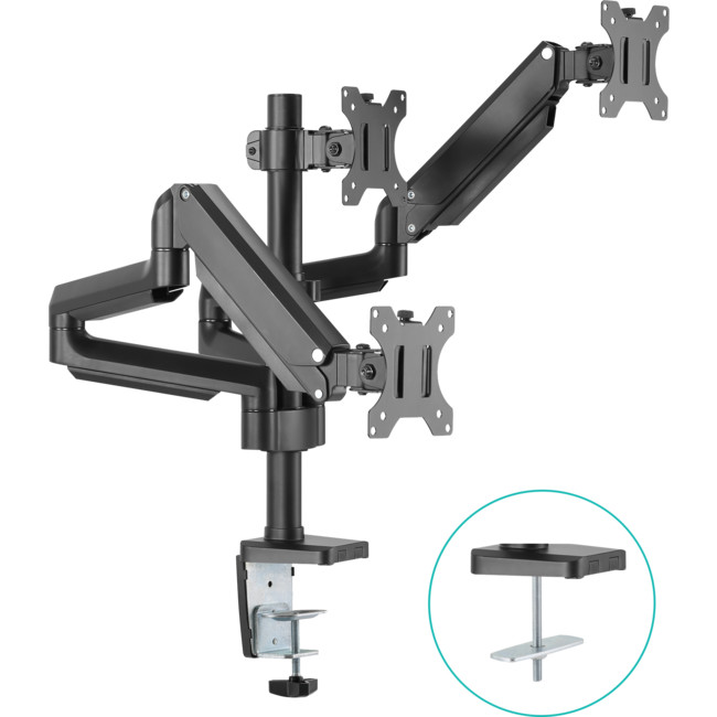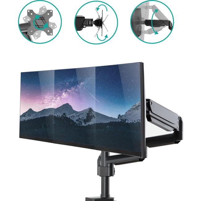 Enhance your workspace with the activiva ErgoLife Triple Monitor Gas Spring Monitor Arm, accommodating three monitors (17”-27”) in a sleek side-by-side setup. Features include versatile positioning, effortless mounting with 360° rotary VESA plates, and sturdy steel/aluminium construction supporting monitors up to 7kg. Easy installation options and effective cable management complete this ergonomic solution.