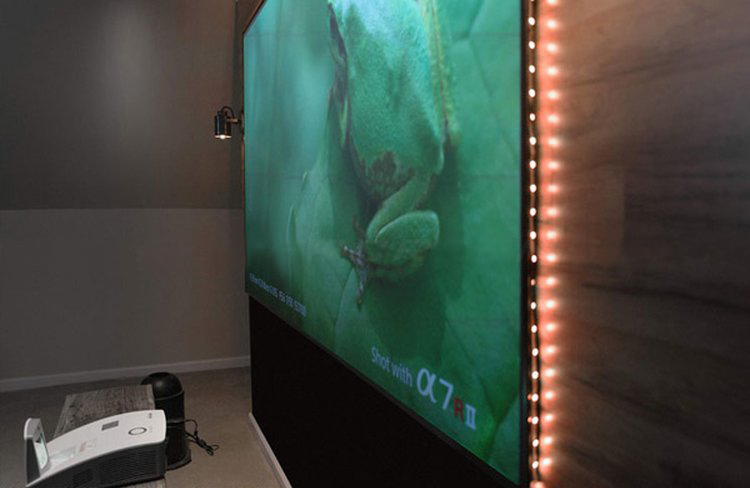 TheAeon CLRis an EDGE FREECLR fixed frame screen that uses Elite's innovativeStarBright CLR(Ceiling Light Rejecting) material.