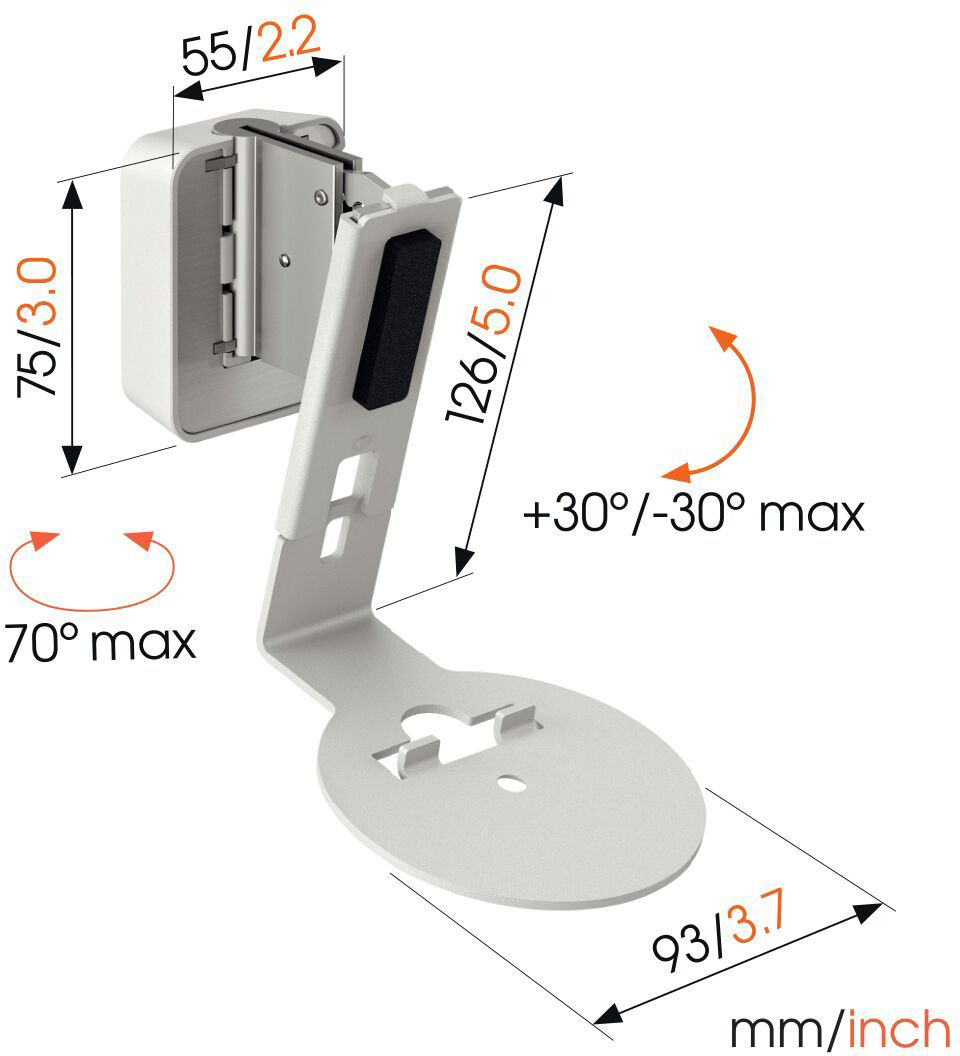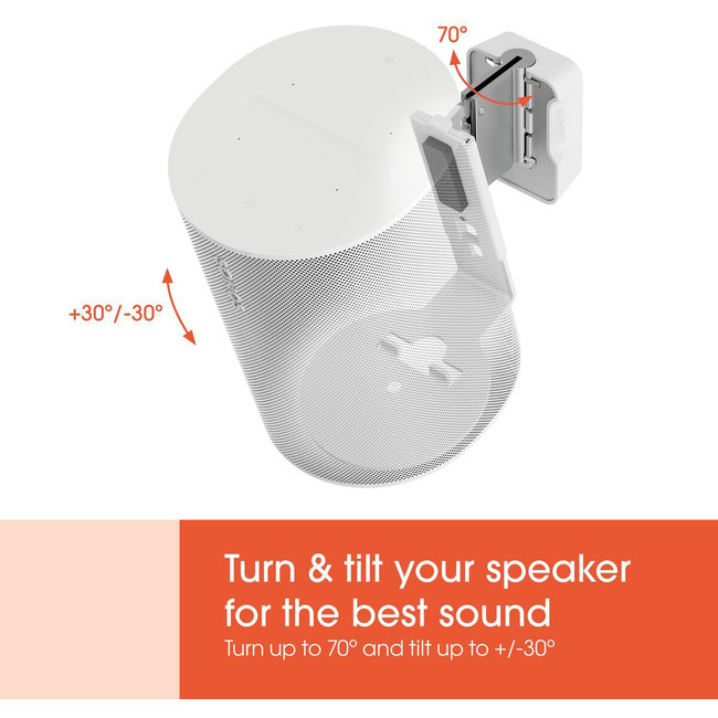 This speaker mount has been specially designed for wall mounting Sonos Era 100 speakers. With a swivel range of up to 70° and a 30° tilt range (upwards or downwards), the Vogel's speaker wall mount allows you to adjust your speakers to the perfect angle.