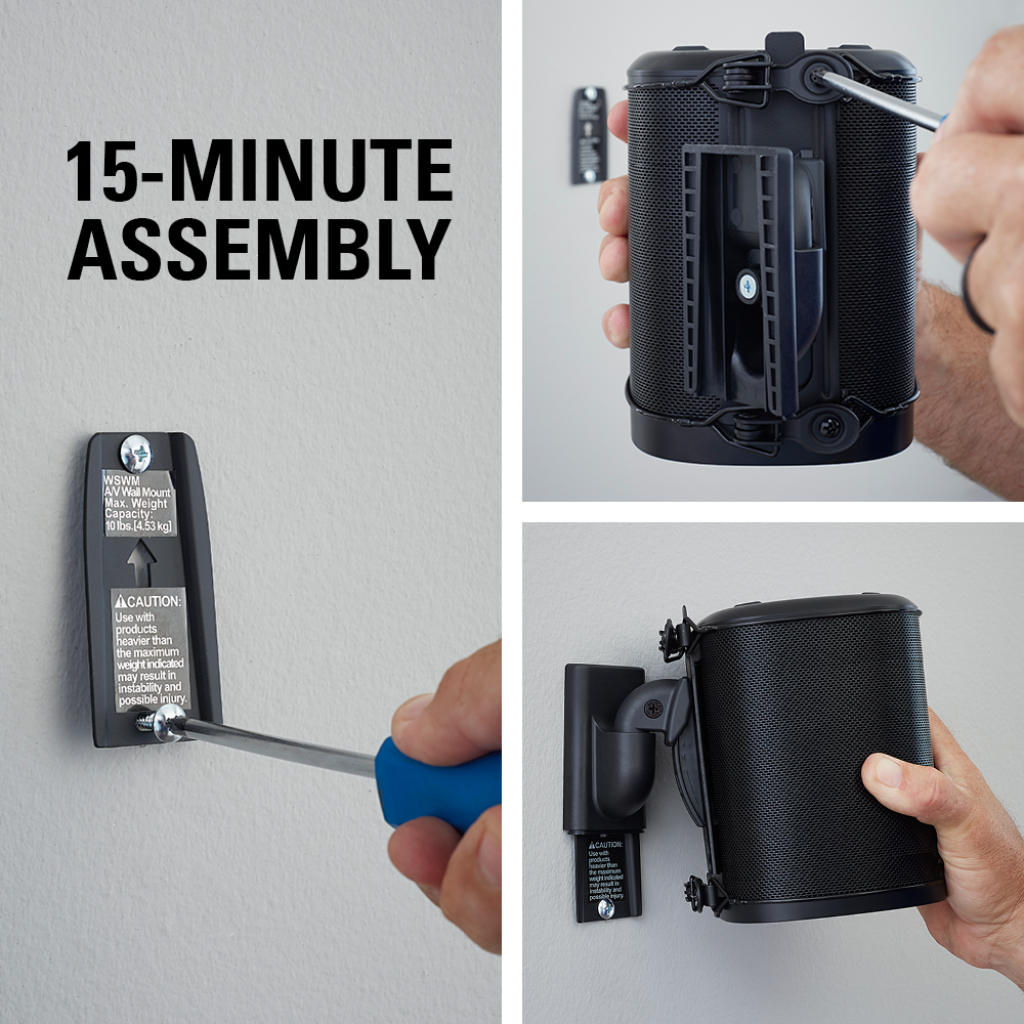 Installing to drywall, wood studs or concrete in only 15 minutes and boasting effortless tilt and swivel capability,the placement flexibility of theWSWM makes it versatile enough for any system setup and for voice integration technology like that of the new Sonos ONE.