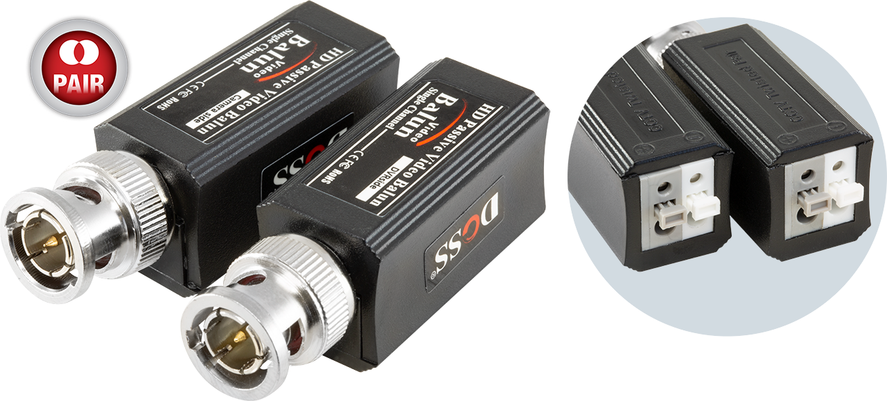 The DOSS Range of UTP Video Baluns allow you to connect your CCTV system using cheaper, thinner, lighter and more readily available CAT5E cable rather than expensive and bulky RG59U cable.