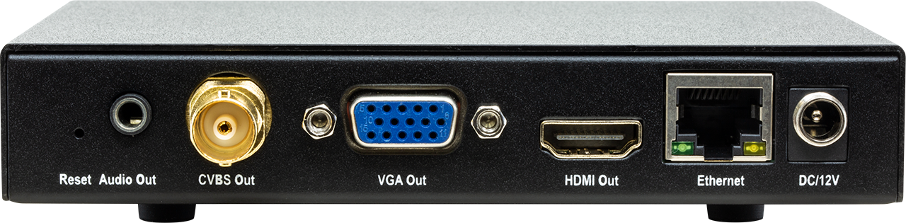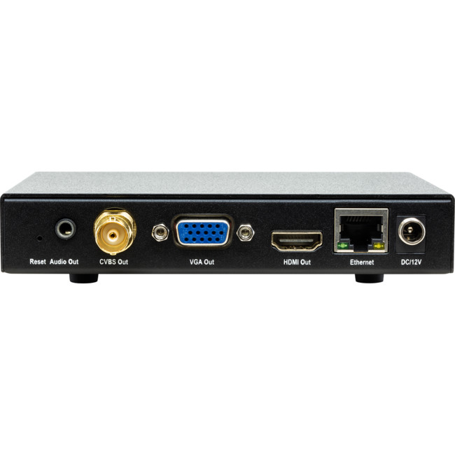 ? Support RTSP/HTTP TS/HTTP FLV/RTMP/UDP Input and HTTP PTE decoding protocols. ? Support H.265/H.264 Video decoding. ? Support HDMI /VGA/CVBS/3.5mm L/R Audio output. ? Support max 4 channels of video stream decoding. ? Support output video resolution setting. ? Support Ethernet port transmission speed 1000mbit / s. ? HTTP WEB, support login and password settings. ? Support multi-viewer function (decoding channels 1-4).