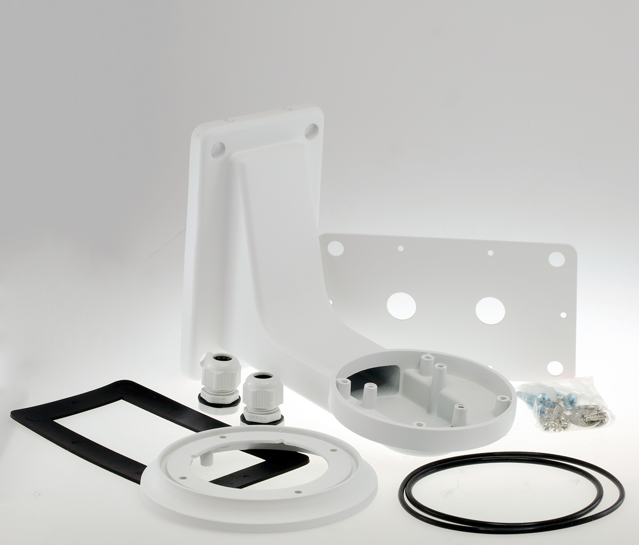 The J11 dome camera mount is perfect for fixing the DOSSDome Cameras to a wall (using screws) or pole (using U-brackets). When assembled with the FHDDOME or the DOME15PRO the bracket is weather-proof (IP66), providing a generous cavity and protection for connections and baluns etc.