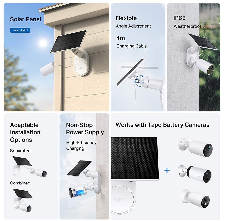 Compatible with all Tapo Battery Cameras (Tapo C425, Tapo C420, Tapo C410, and Tapo C400), enabling your Tapo battery camera to protect you all year round.
