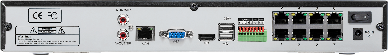 - Provides PoE (Power Over Ethernet) to 8 cameras