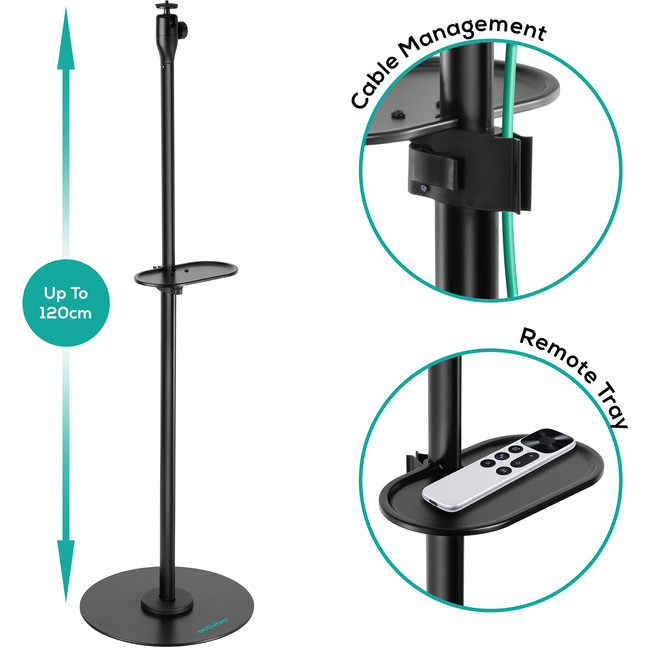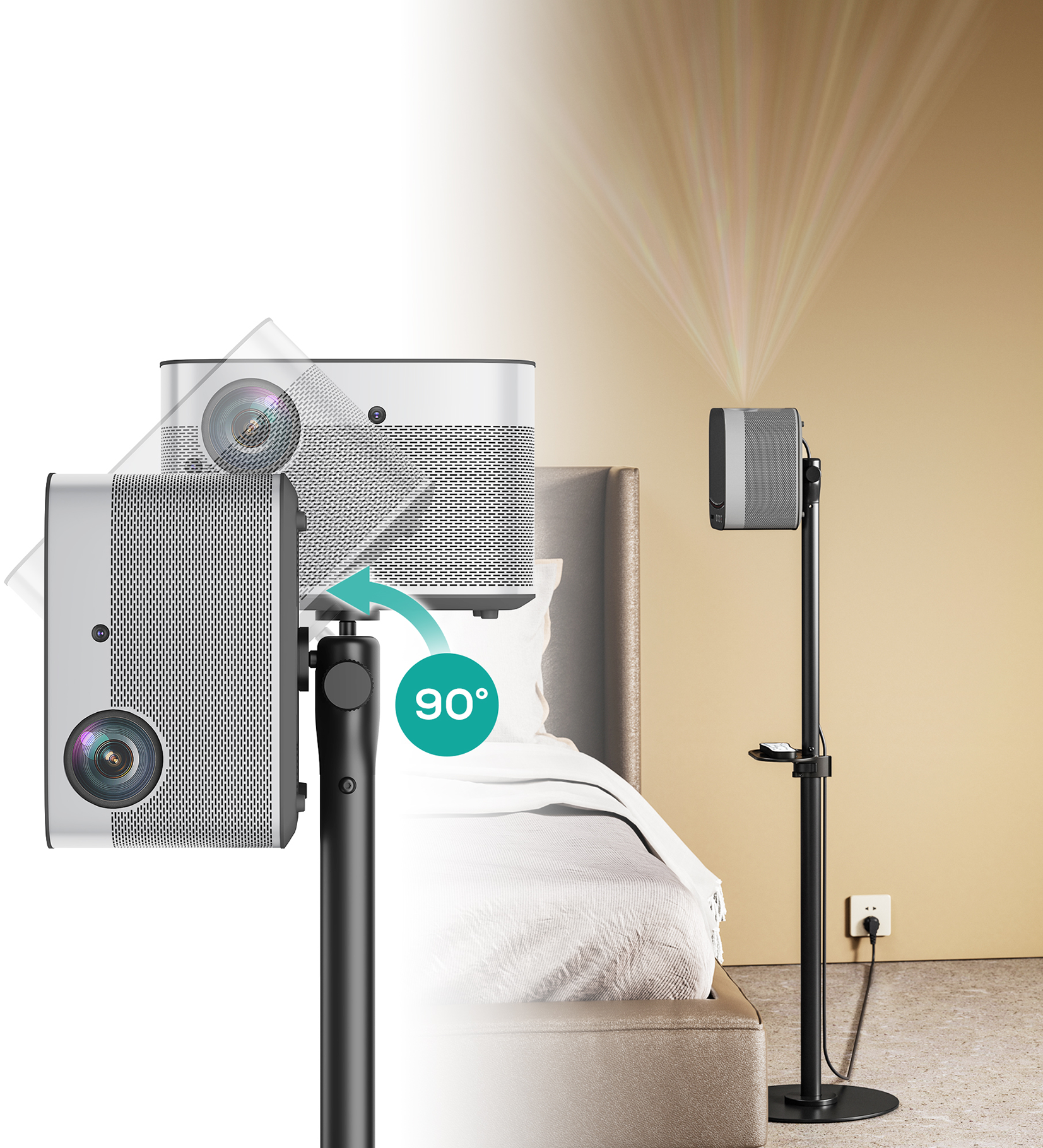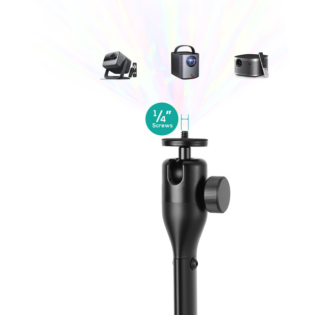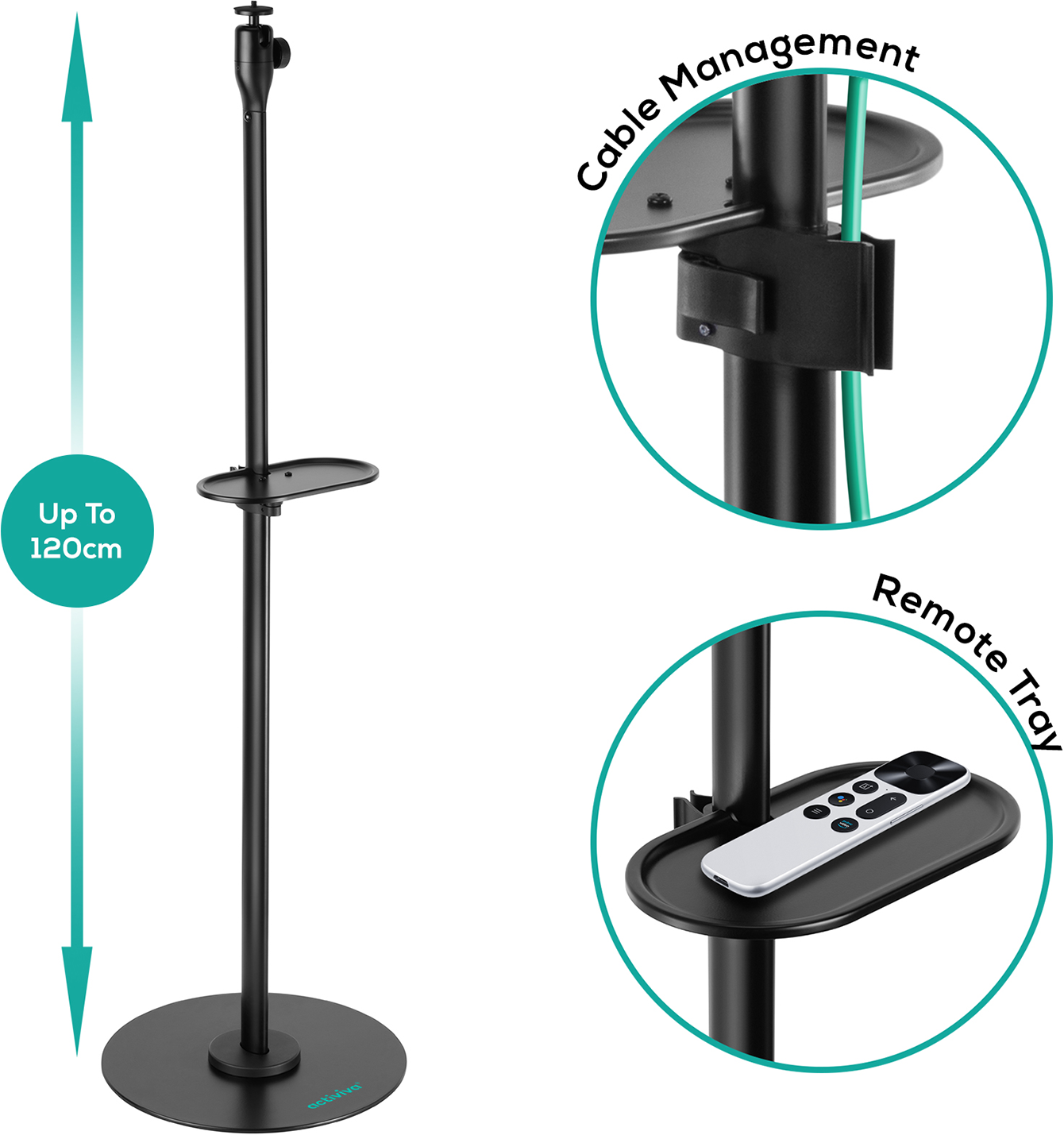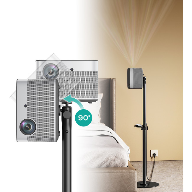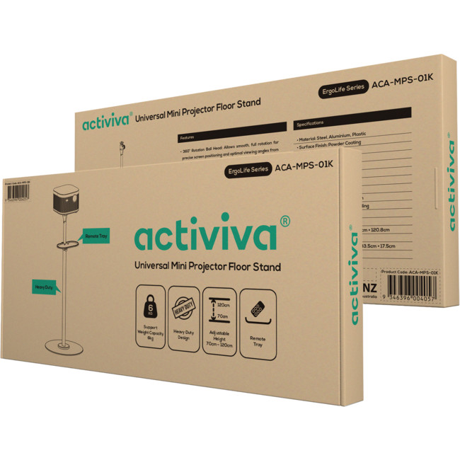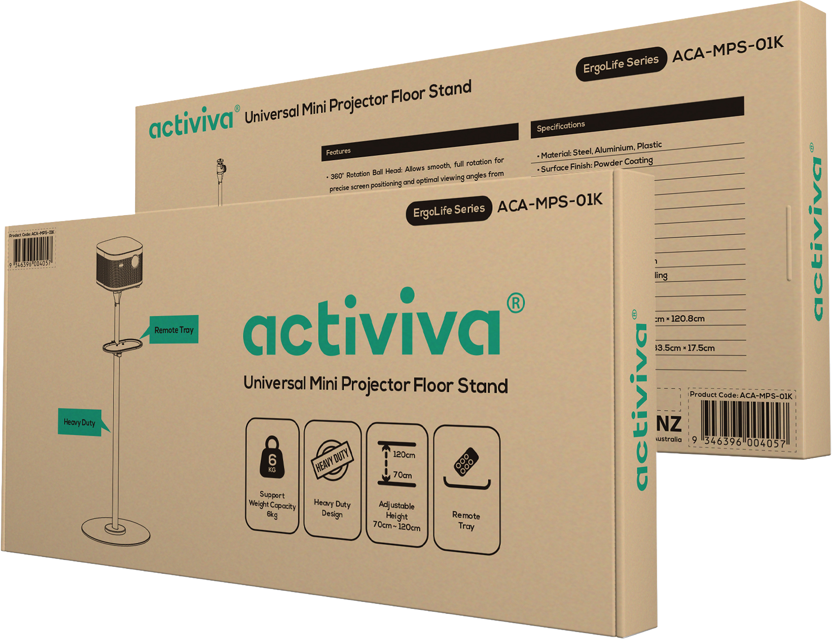 The activiva Mini Projector Floor Stand offers 360° rotation, adjustable height, and universal compatibility with most projectors using ¼” screws. Its sturdy steel construction, built-in storage shelf, and integrated cable management make it an ideal addition to any home theatre setup, supporting popular brands like XGIMI, Nebula, and JMGO.