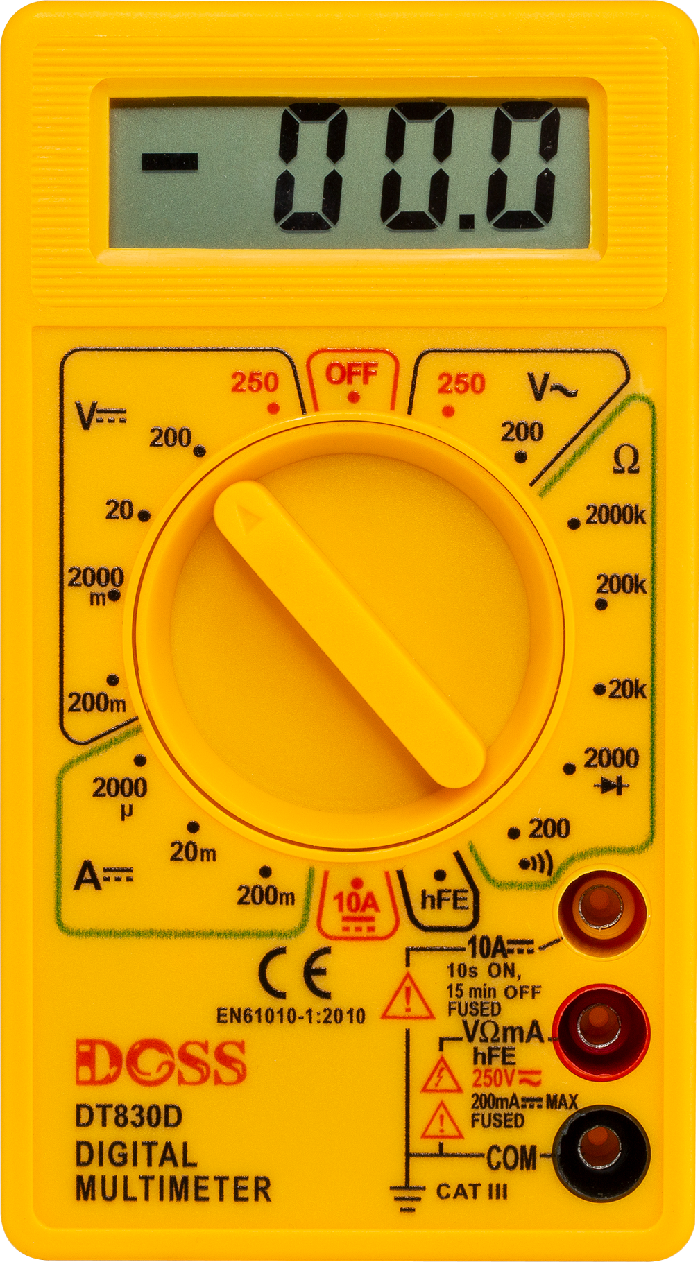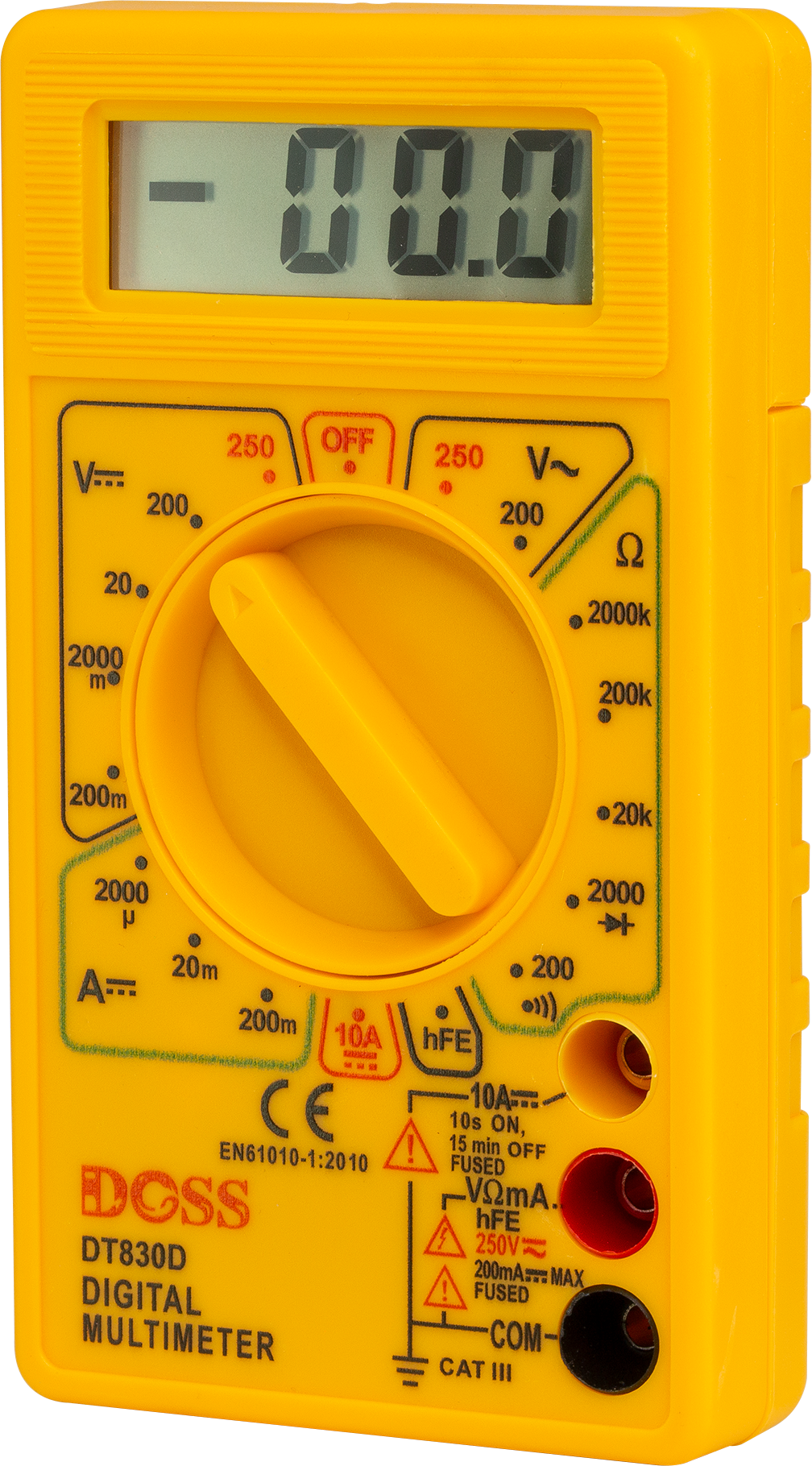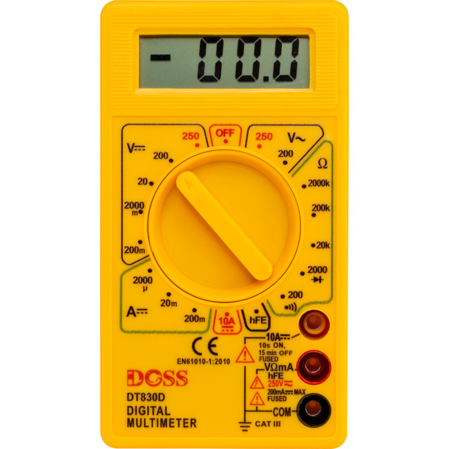 The Doss DT830D is a general-purpose, low-cost digital multimeter designed for everyday use. It features a sturdy yellow case and shrouded probes for added safety. This improved model now includes the ability to test current of 0.8mA (square wave output).