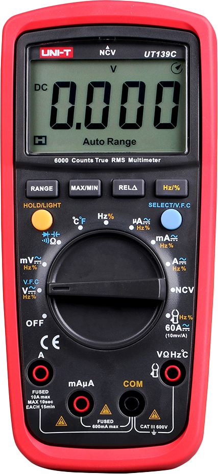 Key Features UT139 Series digital multimeters are newly designed to offer users better performance and higher safety rating. Totally over-load protection and unique structural design make it new type of multimeter with high performance/ price ratio and a best choice for electricians used in electrical maintenance and repairing. 1.True RMS for the whole series; 2.Measure signals with varied frequency (VFC); 3.Measure large capacitance up to 100mF; 4.Optional AC/DC 60A current clamps in different models tomeasure current up to 60A(1mv=1A); 5.NCV designed for the whole series, a necessity for electricians; 6.AA1.5V*2(5#) battery, easy for users to purchase and replace; 7.Soft rubber holster is easy to stand 2m drop; 8.Optional magnetic hanging strap offered to facilitate tests in special location; 9.Fast to replace fuse, just by opening battery cover; 10.Reliable with use of internal 2PCS fuses with high-breaking capacity; 11.Protection against 600V input/1 minute from misconnection; 12.Safety Rating: CAT III 600V.
