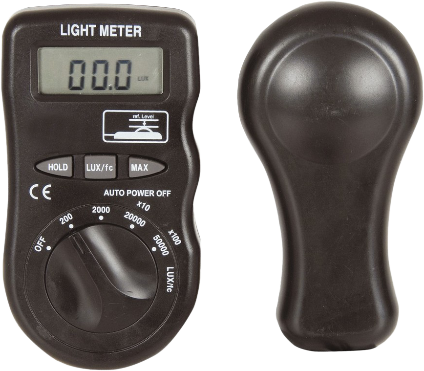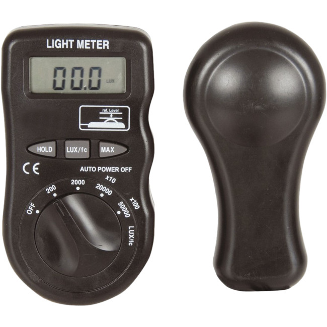 A handy digital lightmeter for photography, lab work, architectural, engineering and construction applications. It includes an integrated stand and will measure incident light in 4 ranges: 0.01 to 200, 200 to 2,000, 2,000 to 20,000 and 20,000 to 50,000 lux. The photo detector is wired on a curly cord which extends to 1 metre, allowing the user to take light measurements at the optimum position. Sensor cover included. Features: • 1999 Count LCD • 3.5 Digit Readout • Auto Zeroing • Data Hold • 3 Ranges • Seperate Photo Detector