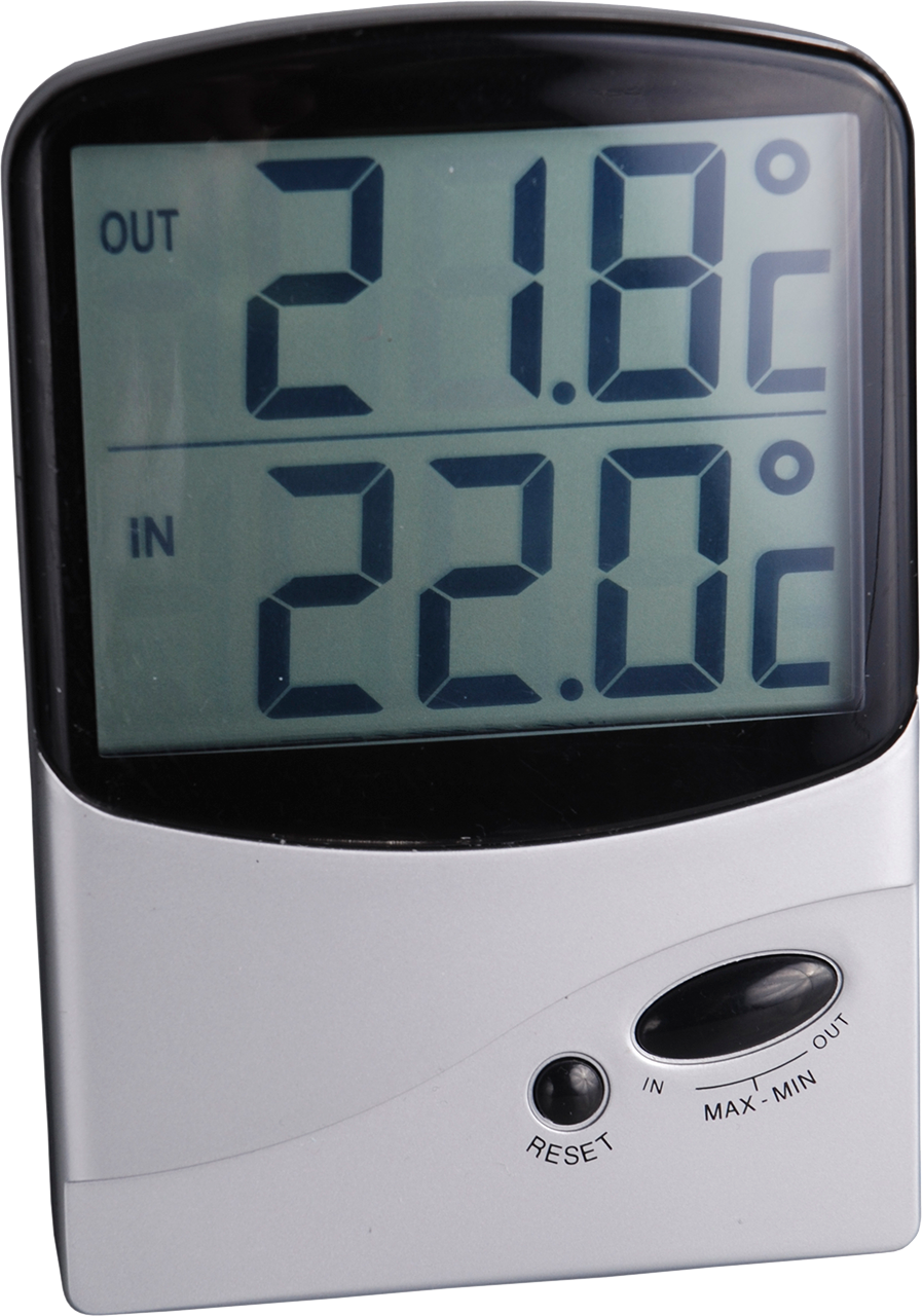 One display that shows both the inside and outside temperatures simultaneously. It will also record the minimumand maximum temperatures. The outside temperature sensor is waterproof and is on a 3 metre cable. It also has a tilting bail for standing as well as a keyhole for wall mounting. Jumbo digits for the optically challenged.
