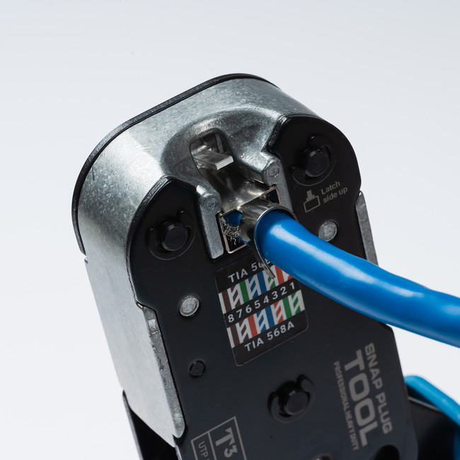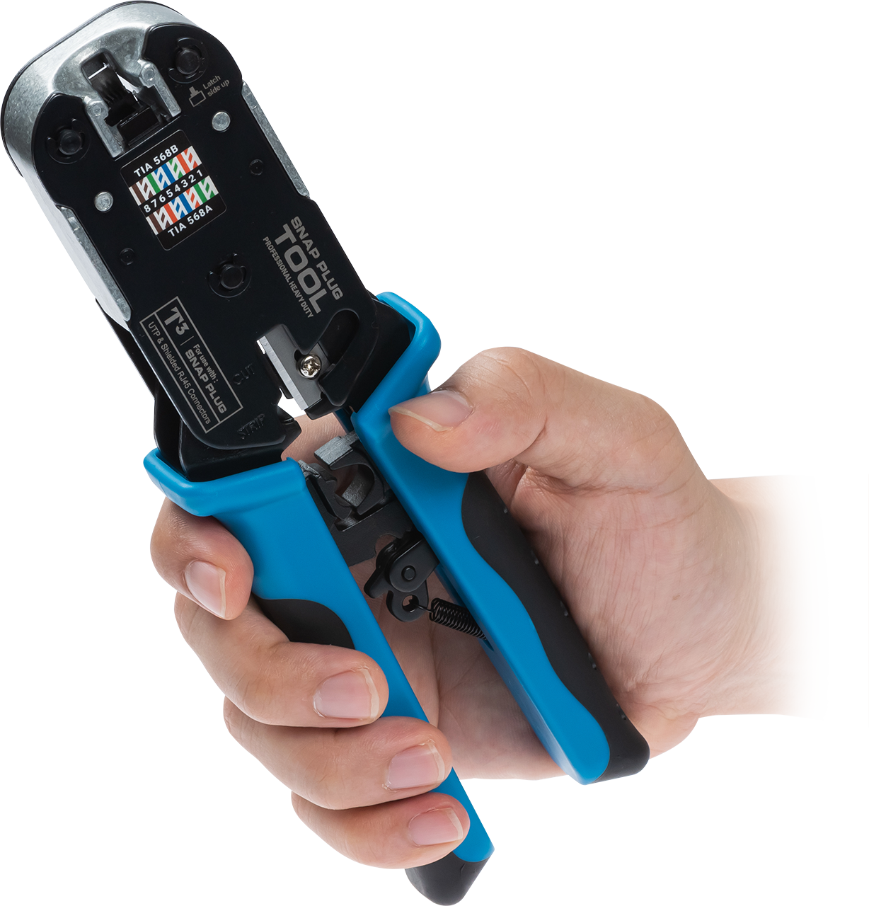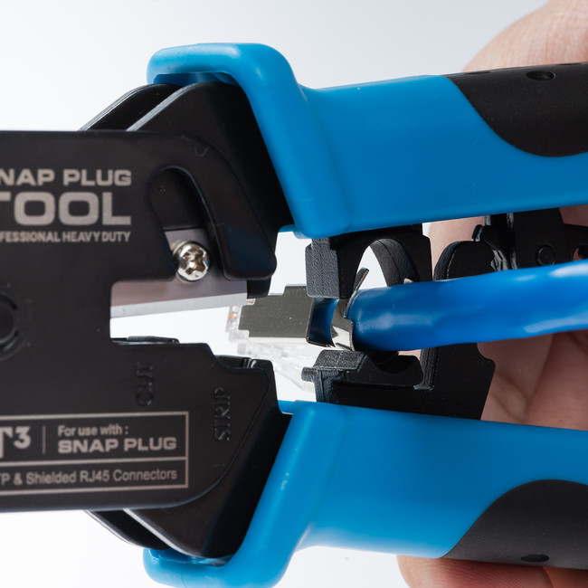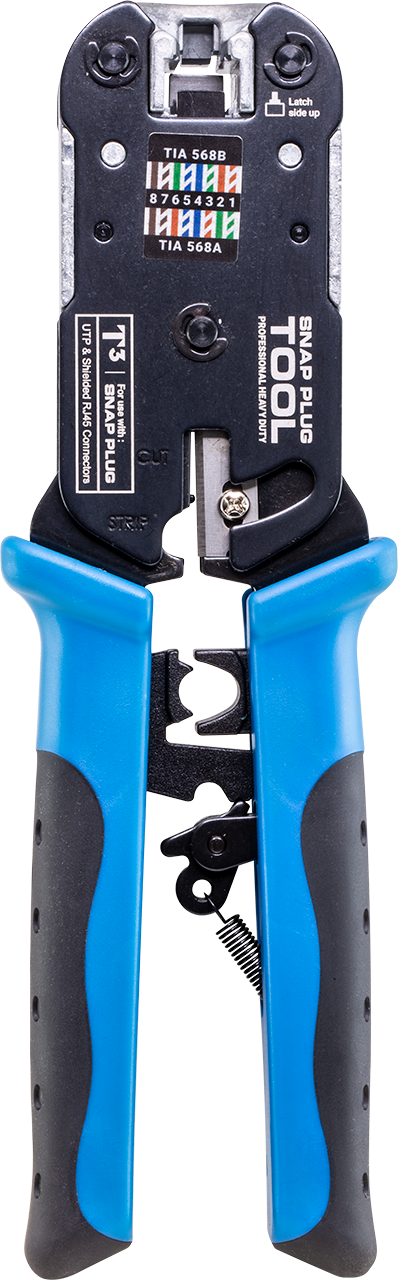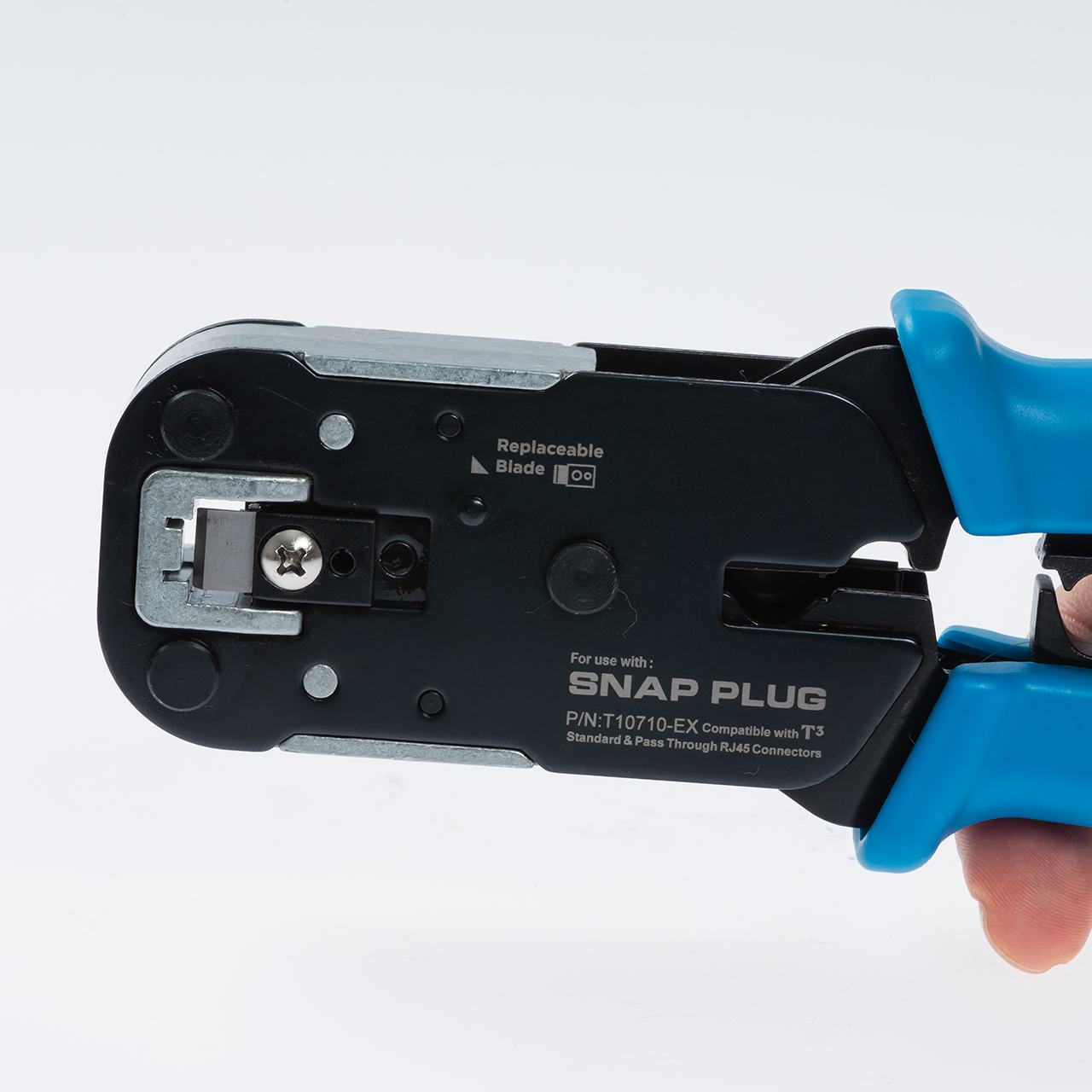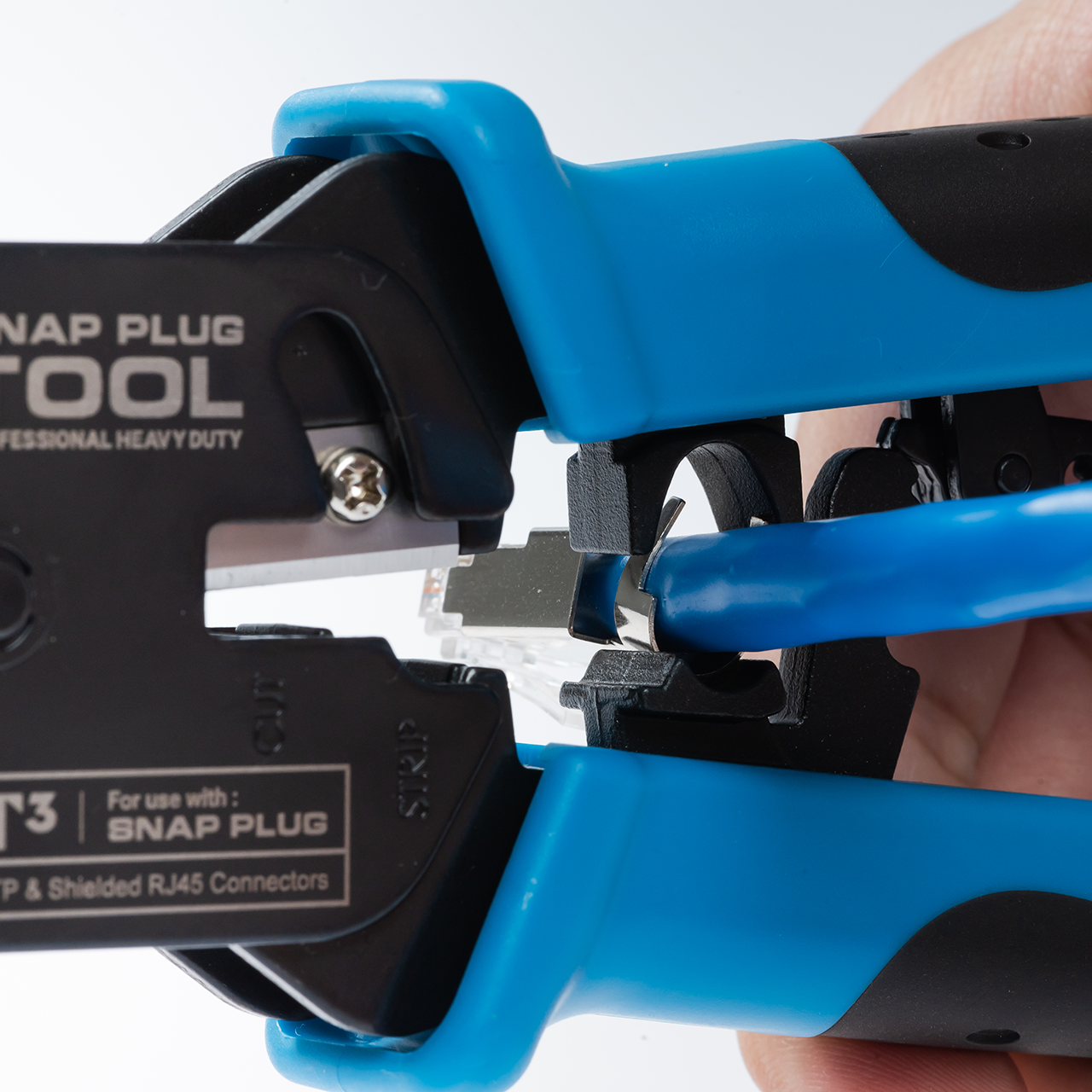 This tool is designed for use with SNAP PLUG Pass-ThroughModular Plugs. Crimp and trim in one easy step. Good for professional installation that requires high performance. While crimping, this tool will crimp and trim at the same time, increase efficiency at work, and reduce unnecessary crimping errors. It's a tool that could meet multiple needs for professional use and achieve the best termination in every single crimp.